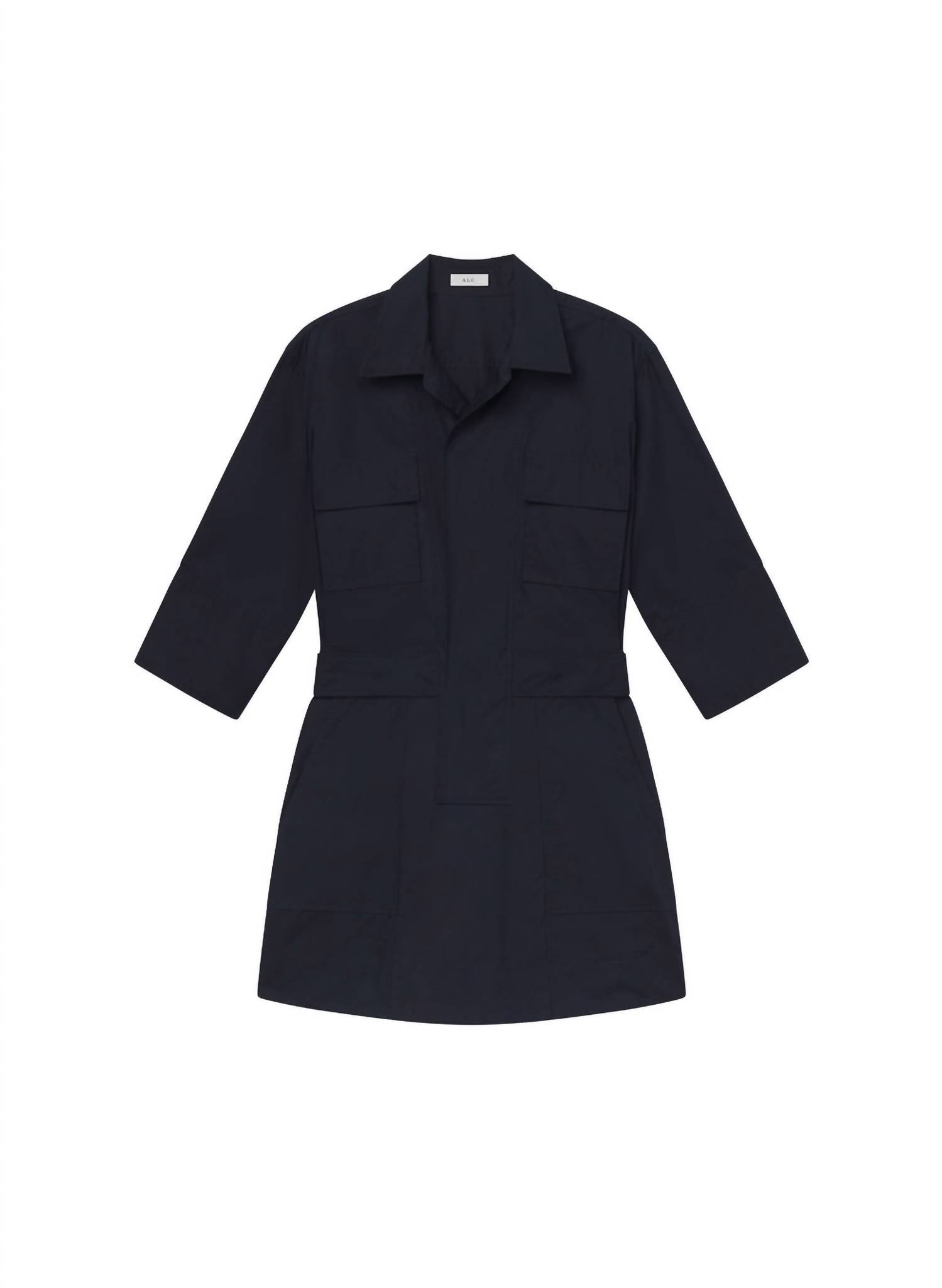 Discover the Women's Evan Mini Shirt Dress by A.L.C., an elegant addition to your wardrobe perfect for cocktail parties. Crafted in navy polished cotton poplin, this shirt dress combines sharp utilitarian details like oversized pockets with a flattering, waist-enhancing silhouette. The design features a classic collar, short sleeves, and a button closure for easy wear. Measuring 34.5" in length, this cotton dress is easy to care for with machine wash in a net bag or dry clean options. Model is 5'10" wearing a size 4, with product measurements for size 4 including a 37.5" bust, 32.5" waist, and 40" hips.