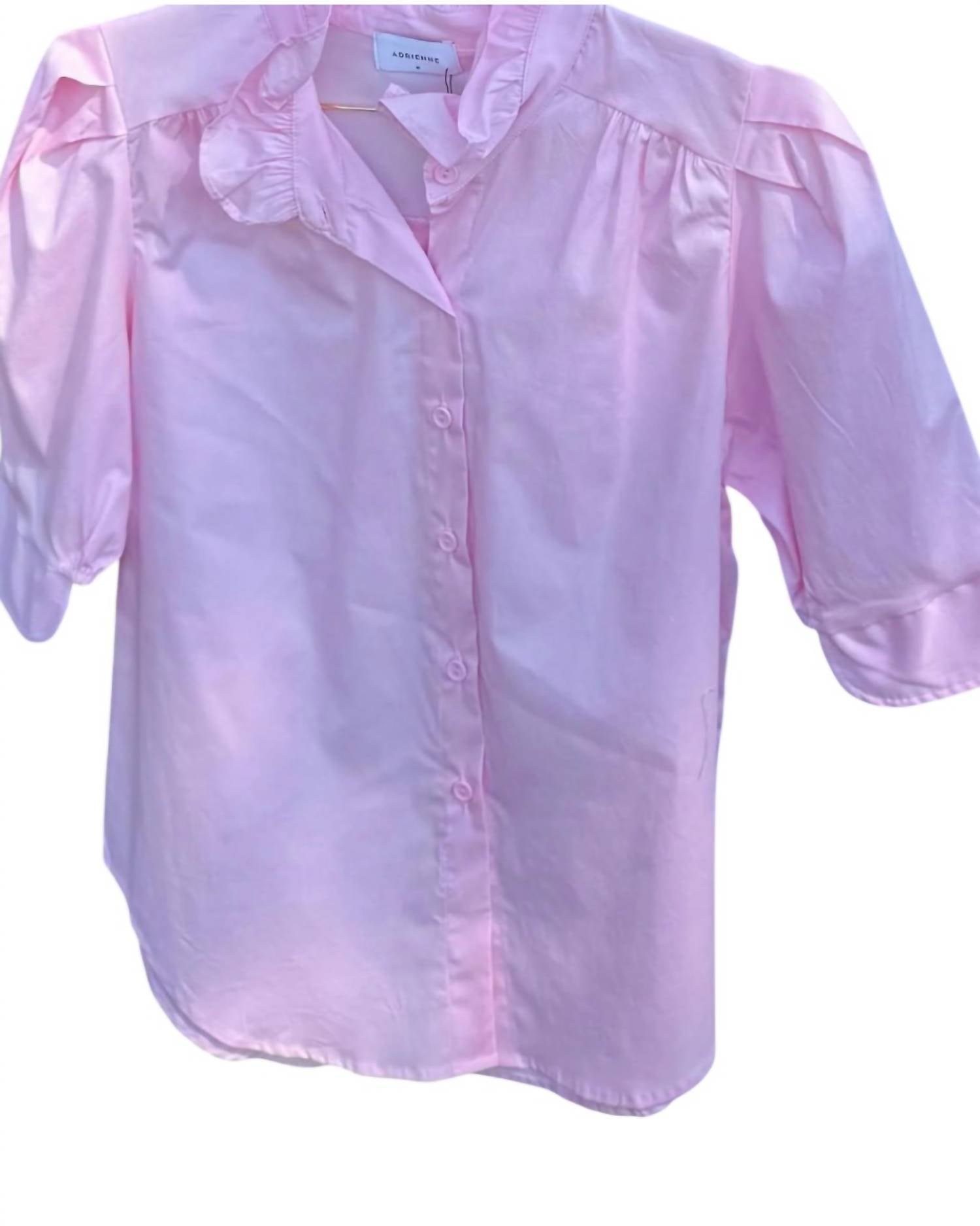 Discover the Women's Jodie Stripe Top by ADRIENNE, a minimalist pink blouse perfect for summer escapes. Showcasing a classic collar and short sleeves, this top is characterized by its stylish stripe pattern. It features a button closure and is crafted for a carefree, active lifestyle. Care is simple with hand wash and line dry instructions, ideal for vacations and special occasions.