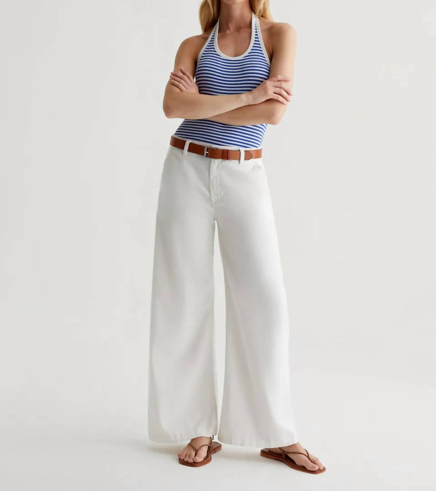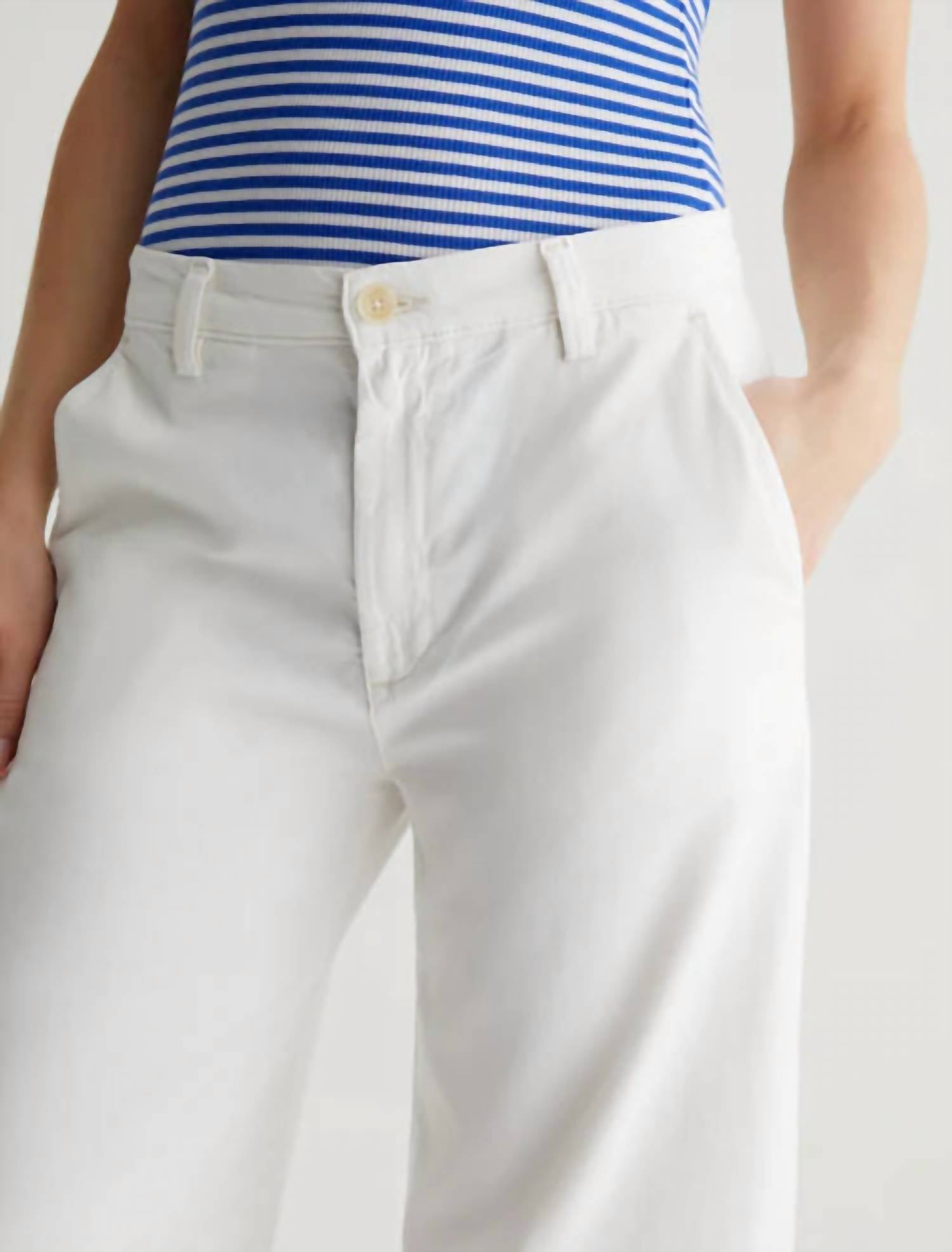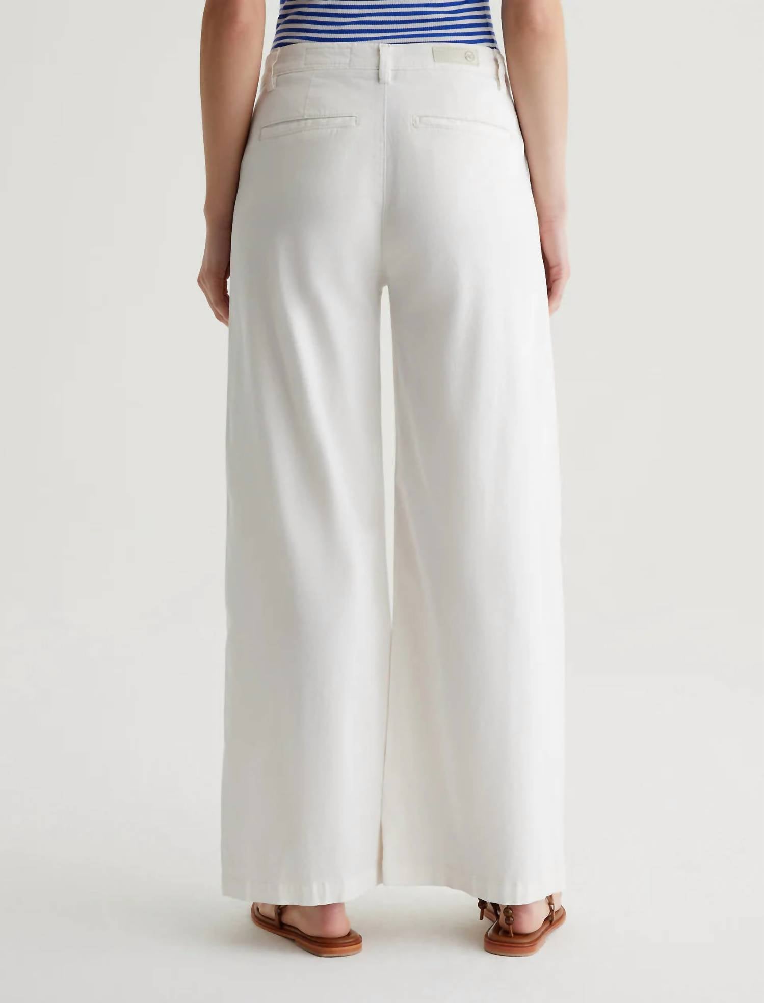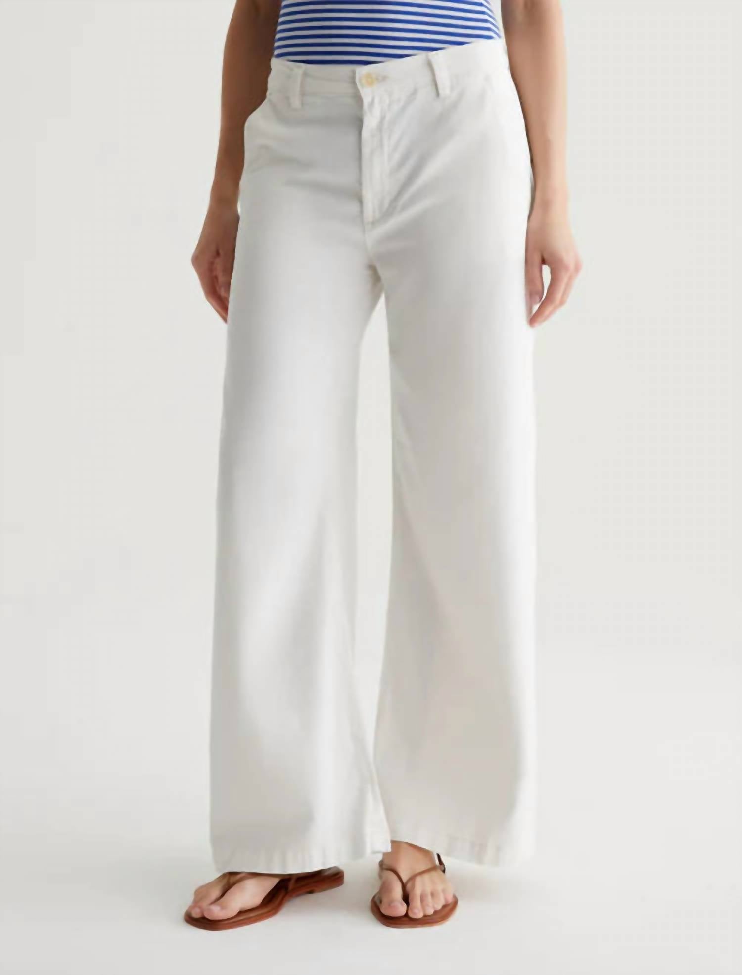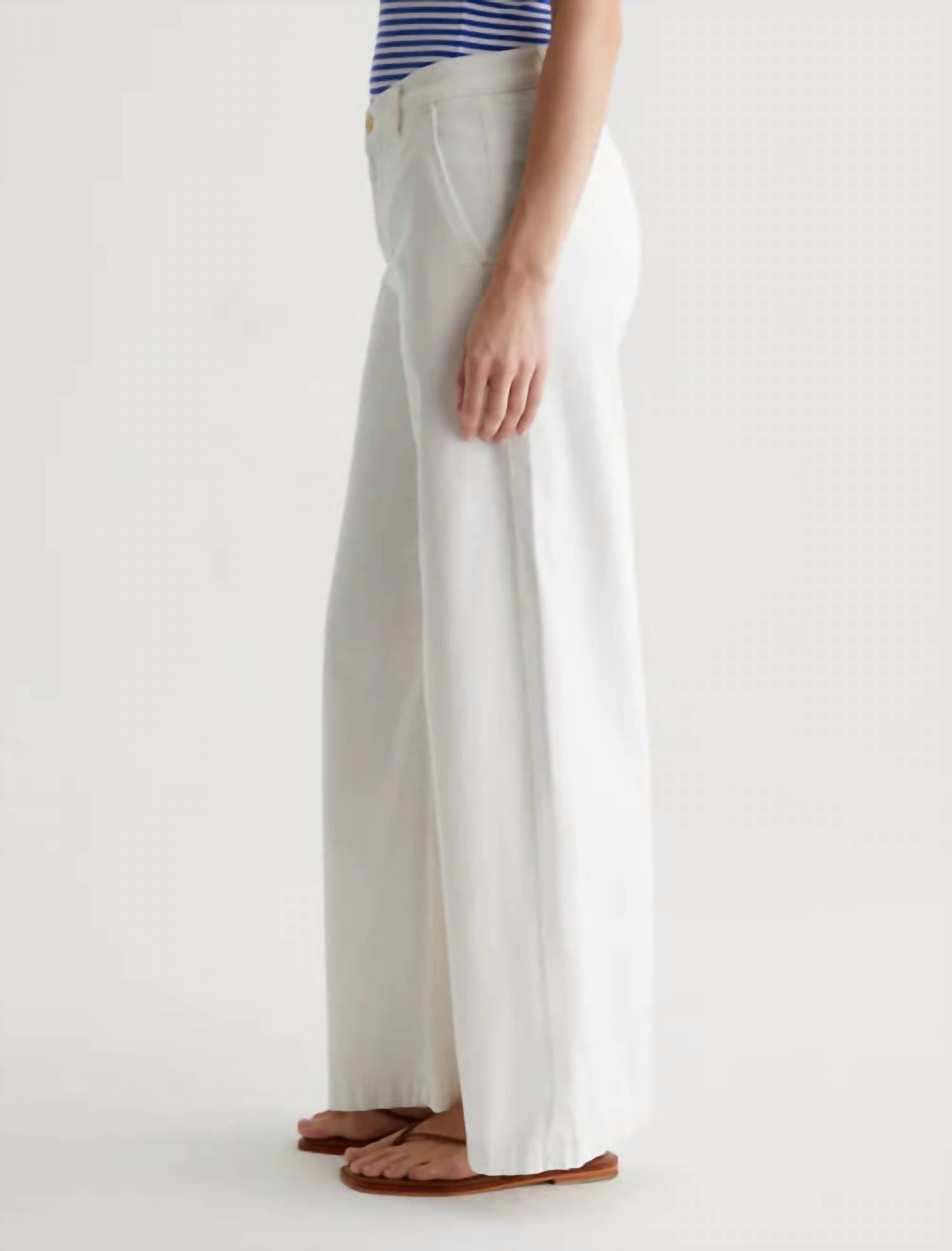 Introducing the Caden Wide Leg Jeans by AG Jeans, a minimalist masterpiece in powder white, designed for the ultimate relaxed fit. These women's trousers boast a wide-leg style with a mid-rise and are crafted from a soft 6.2 oz. Stretch Cotton Tencel Twill, comprising 60% Lyocell, 38% Cotton, and 2% Spandex. They feature slant front pockets, welt back pockets, and a convenient button closure. Care for these with ease: machine wash and tumble dry. The model is wearing size 26 with a front rise of 10 1/2", knee opening of 23 1/2", bottom opening of 25", and an inseam of 29".