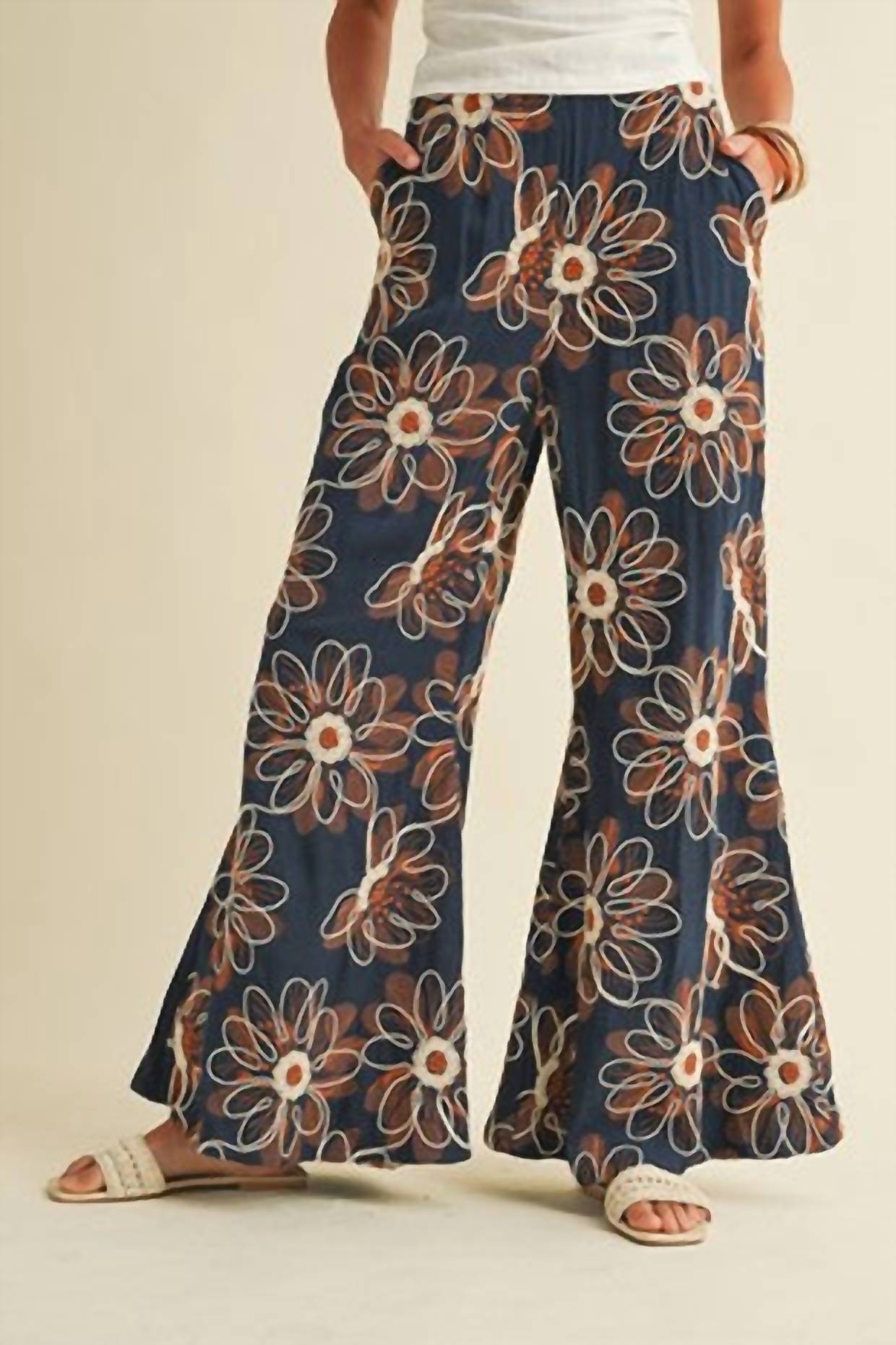 Experience effortless summer style with the Floral Embroidery Wide Palazzo Pant by AnnieWear. These patterned blue trousers offer a relaxed fit and a wide-leg design, perfect for vacation and casual outings. Featuring convenient pockets and a pull-on closure, they embrace maximalist trends. Care instructions include machine washing and line drying for easy maintenance.