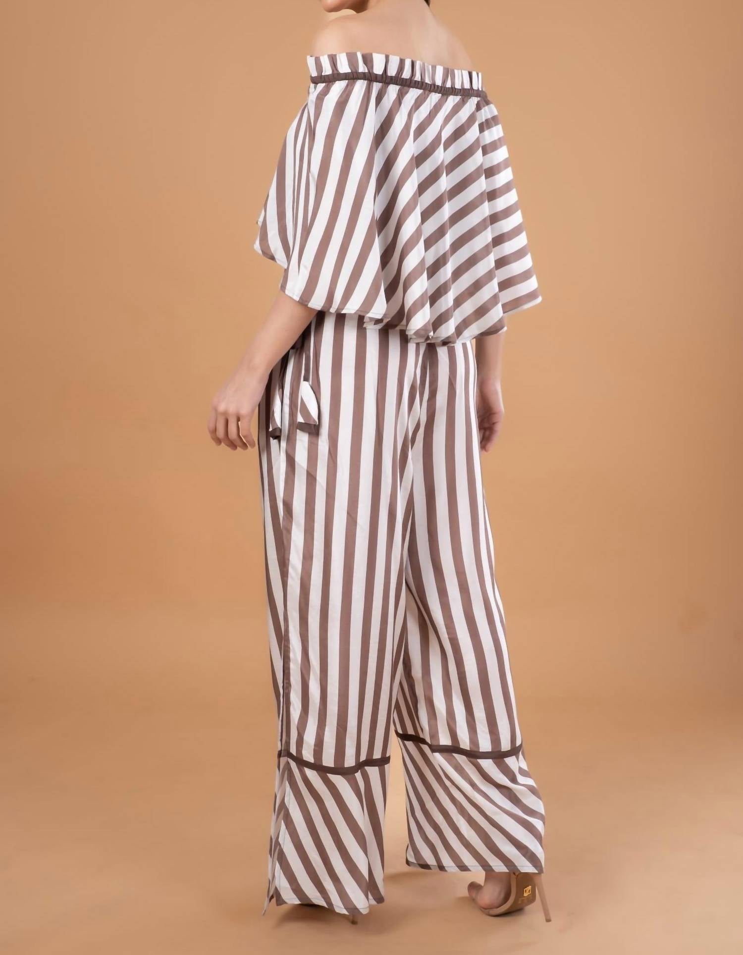 Discover the perfect vacation companion with AnnieWear's Knit Stripe Jumpsuit in a chic mocha hue. This women's jumpsuit features a high-rise waist and a relaxed fit, making it a comfortable choice for summer outings. Its wide-leg design and monochrome stripe pattern offer a trendy look, while practical pockets add functionality. With a convenient pull-on closure, this jumpsuit is easy to wear, and for care, simply hand wash and line dry.