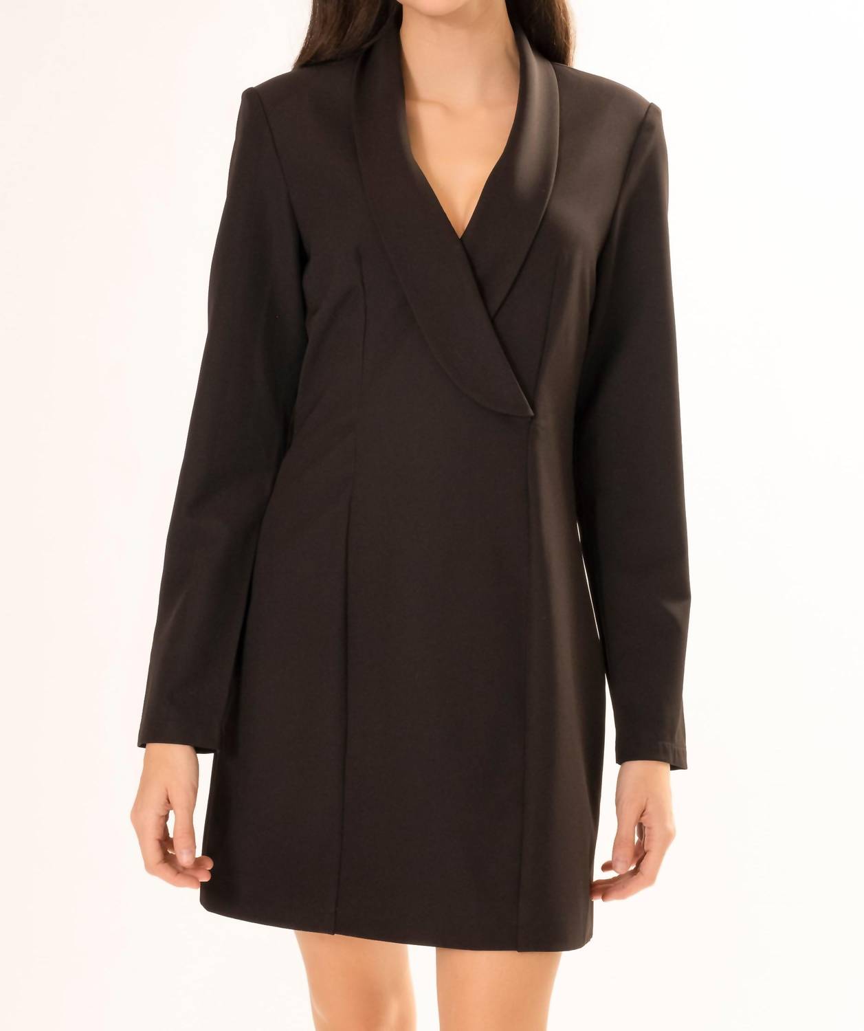 The kind of easy and flattering dress you'll be reaching for all season long. The Linda Blazer Dress by Area Stars is the epitome of sophisticated power dressing, crafted for the modern woman. This long-sleeve, mini dress boasts a sharp double-breasted design and a sheath silhouette, accented by a large lapel V-neckline for a strikingly tailored look. Made in classic solid black, this versatile piece can transition seamlessly from a sleek evening event to a chic fashion-forward statement. Composition and Care: Dry clean only. Ideal for fall and perfect for occasions like a Thanksgiving gathering.