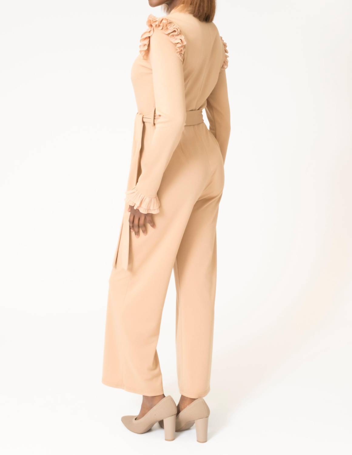 Introducing the Simone Knit Jumpsuit by Area Stars, a stylish beige outfit that epitomizes minimalist elegance. This jumpsuit features long sleeves with ruffled accents for a touch of femininity, and a V-neckline complemented by a mock neck collar for an elevated look. Composition: 95% Polyester, 5% Elastane. Care: Dry clean only. Perfect for vacation or special occasions, it offers a relaxed and comfortable fit with straight-leg and mid-rise waist design.