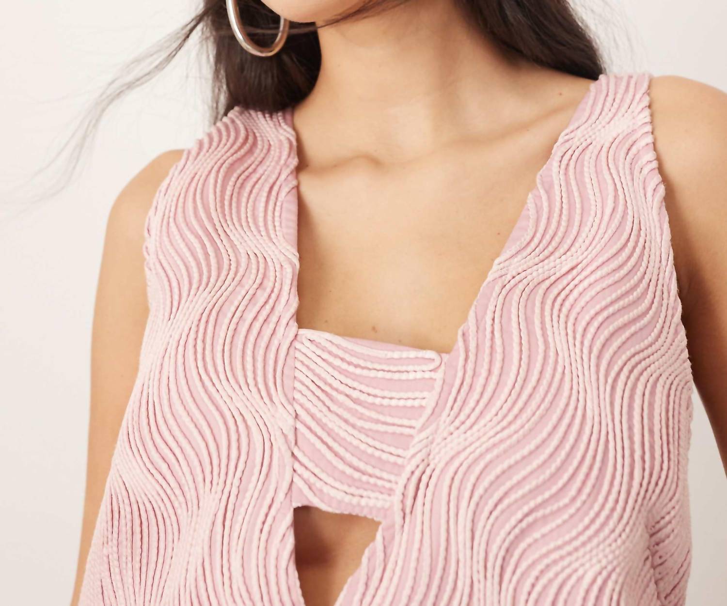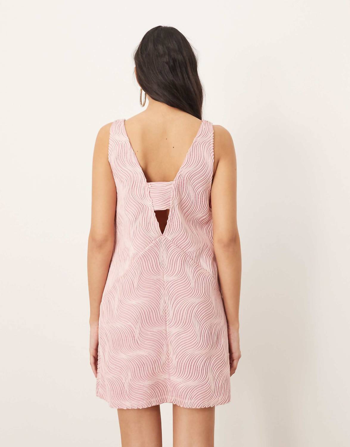 The kind of easy and flattering dress you'll be reaching for all season long. Introducing the Wave Textured Sleeveless V-neck Dress by Arrange, a chic piece perfect for evening events in a soft baby pink hue. This mini dress offers a regular fit with playful cut-out details, set in a shift silhouette that exudes minimalist elegance. Composition: 100% Cotton main with 100% Polyester lining. Origin: Made in India. Care: Hand wash to maintain its textured woven fabric.