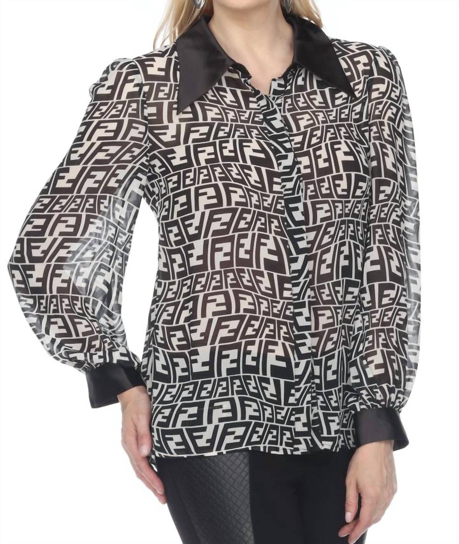 Introducing the Madonna Blouse by AZI, a sophisticated choice featuring a chic black and white print. This patterned blouse boasts long sleeves with button cuffs and a structured collar, ensuring a polished look. Crafted from 100% polyester, with a combination of 97% polyester and 3% spandex, it offers both comfort and style. Closure: Button closure.