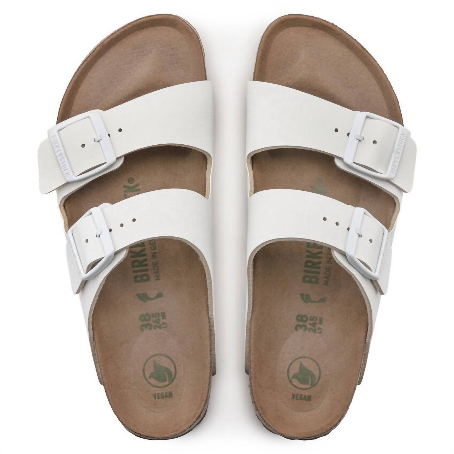 The Women's Vegan Arizona Sandal by BIRKENSTOCK is a timeless classic with a modern twist, crafted entirely from animal-free materials. It features two adjustable straps made of skin-friendly Birko-Flor® nubuck, renowned for resembling real leather, and is fitted with an anatomically shaped cork-latex footbed. The sandal's open toe design is complemented by a color-coordinated EVA sole, making it both stylish and comfortable for summer getaways. Proudly made in Germany, this sandal combines the elegance of a flat heel with boho chic appeal.