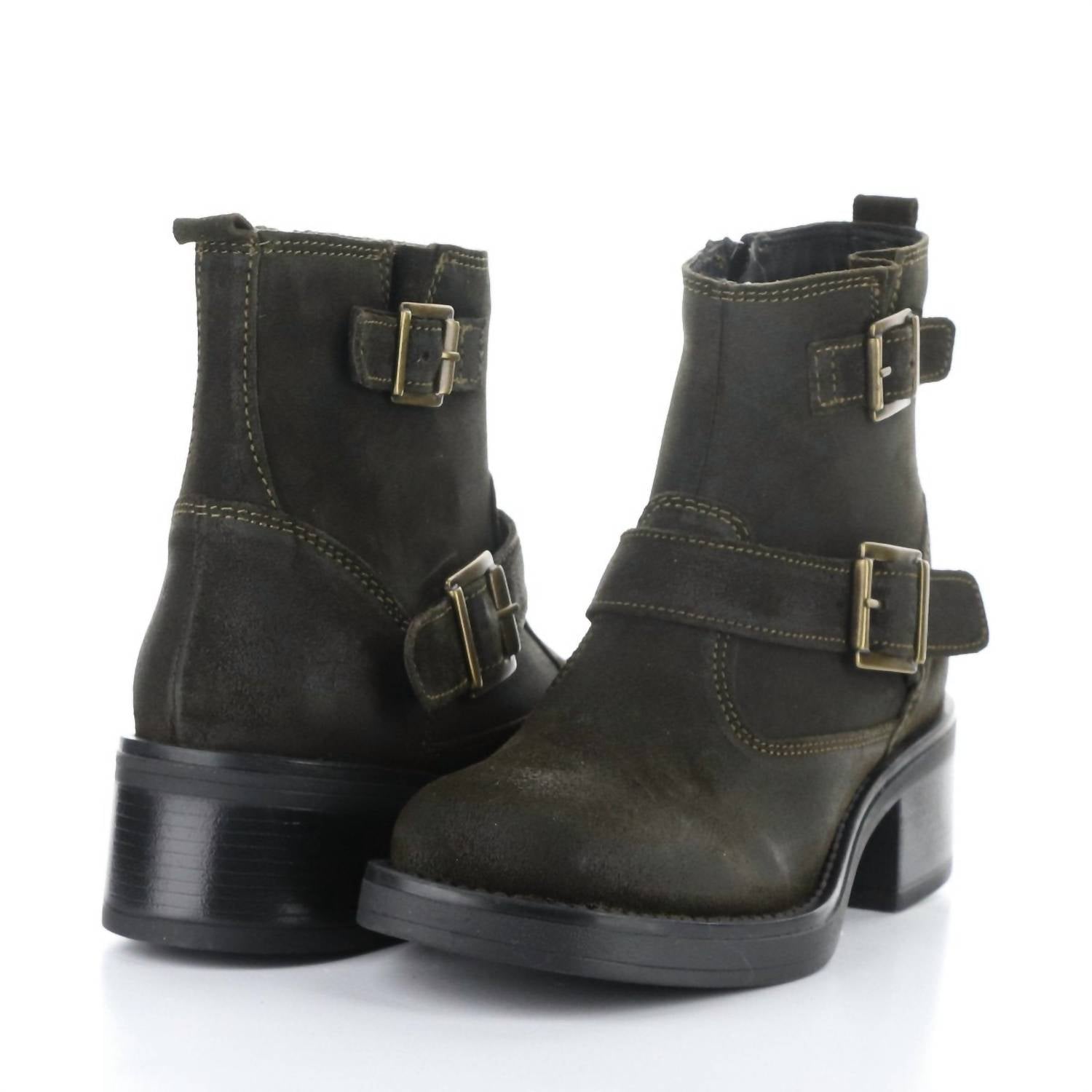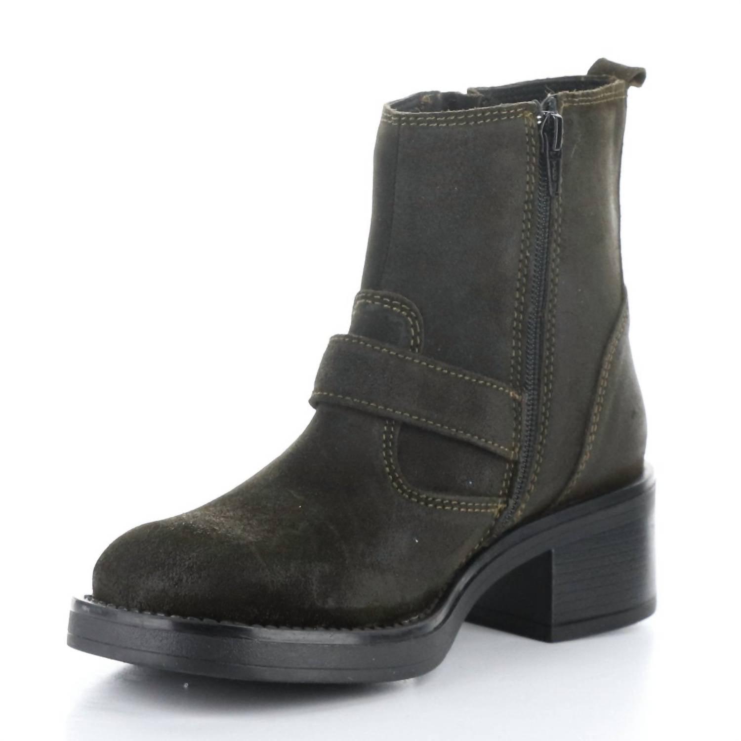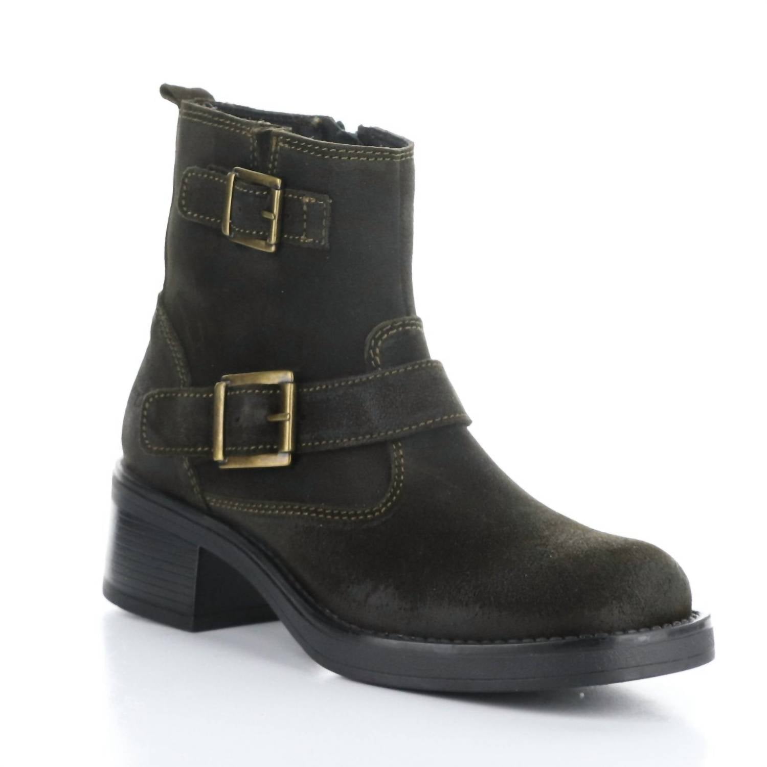 The moto boot trend is here to stay and we especially love this style. Step into style with the Women's Grata Boot by Bos. & Co., blending edgy buckled straps with soft suede leather for a nod to the rider boot trend. These olive booties are crafted in Portugal and offer waterproof protection, making them perfect for any weather. Featuring a convenient side zip for easy wear, they rest on a comfortable block heel with a height of 2 1/4" and a 3/4" platform. With a round toe design, they fit true to size in medium width, ensuring all-day comfort.
