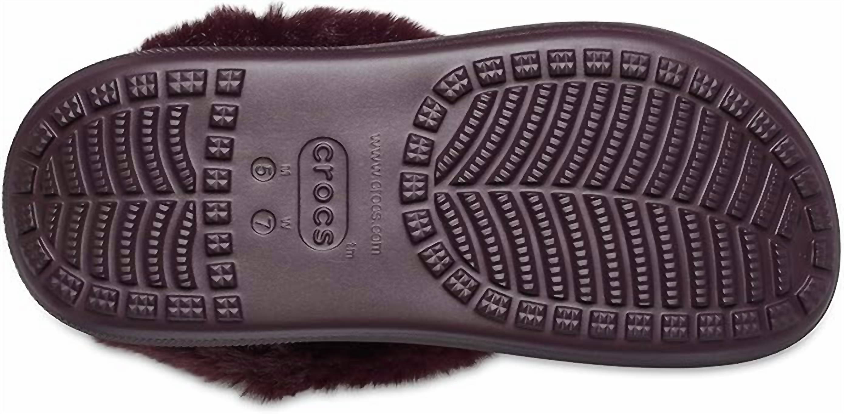 Step into cozy style with the Women's Furever Crush Clogs by Crocs in a rich Dark Cherry hue. These mules boast a round toe and a faux-shearling lined interior and collar for warmth and comfort, enhanced by a 2.4-inch heel height for a unique look and added support. Made from Ethylene Vinyl Acetate, these clogs feature a pull-on closure and dual Crocs Comfort for blissful support. Care for these shoes by hand washing or spot cleaning with mild soap and cold water, avoiding extreme heat to prevent warping.