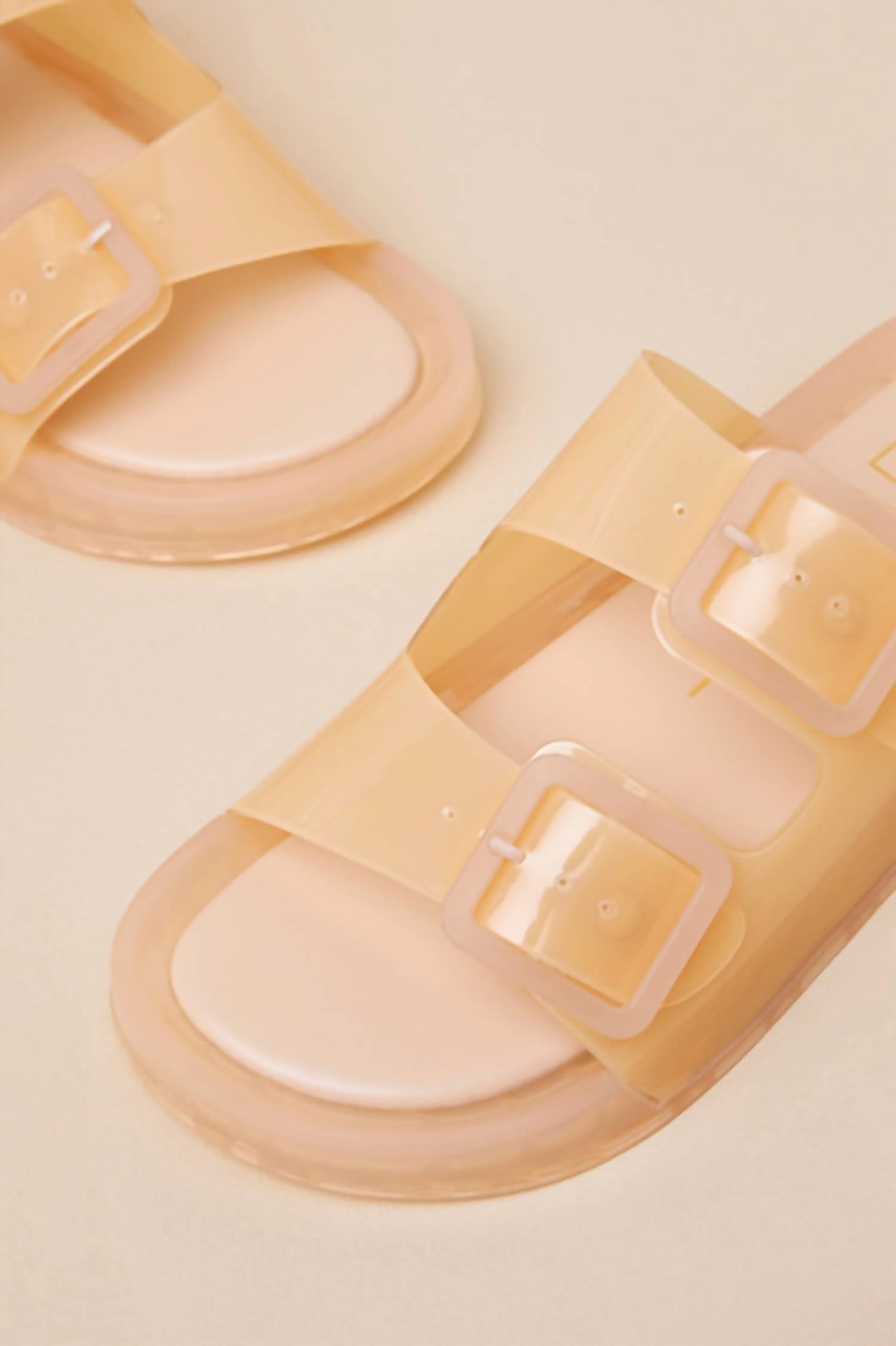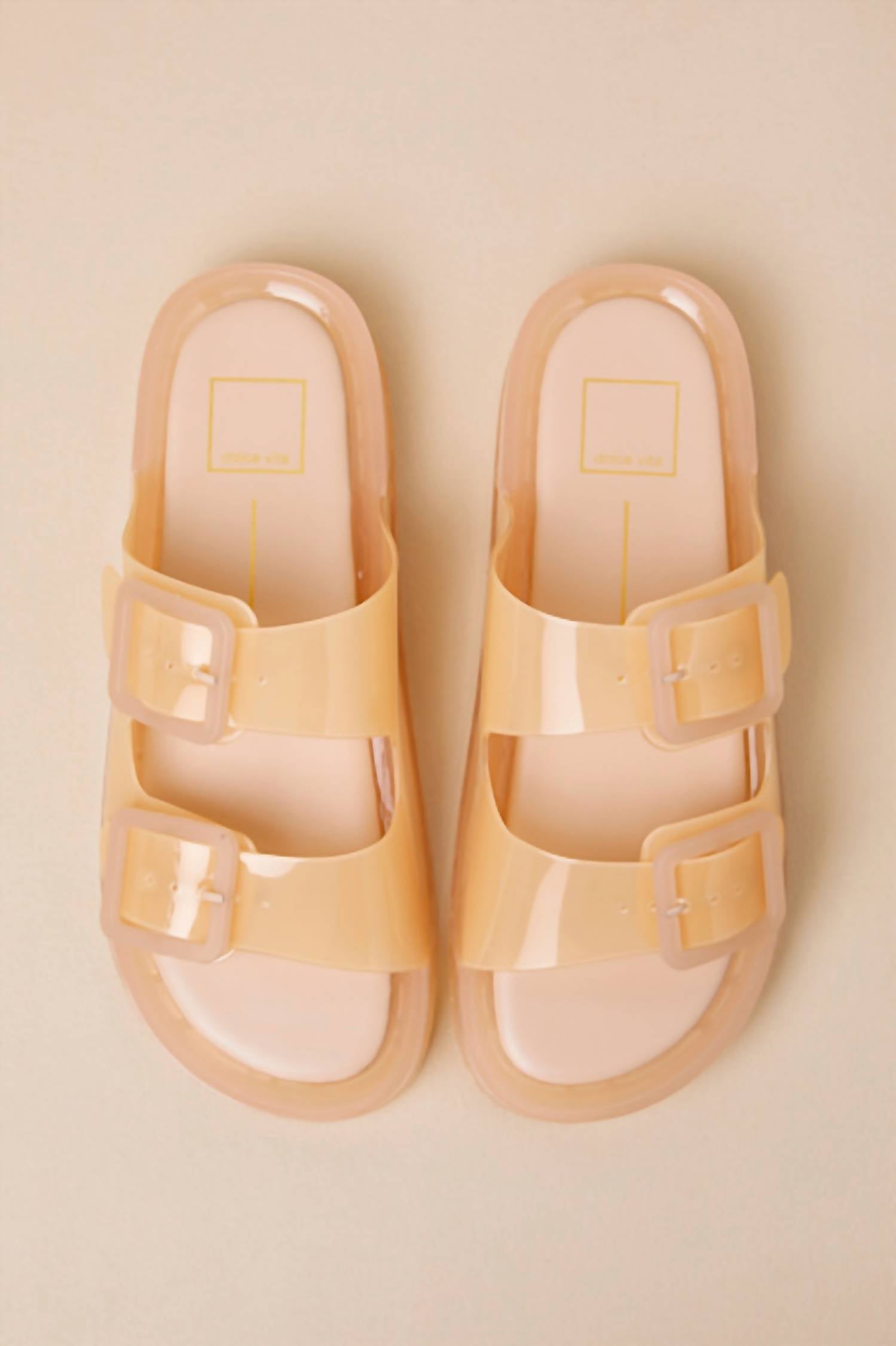 The Women's Julio Slide by Dolce Vita offers both style and convenience for your summer adventures. These praline-colored sandals feature a jelly-like vinyl composition with a round toe and adjustable wide straps with matching buckles. They sit atop a chunky sole with a low 1.75" heel and a 0.75" toe platform for comfortable wear. Made from man-made materials and imported, these slides are available in whole sizes only, perfect for quick and trendy summer styling.