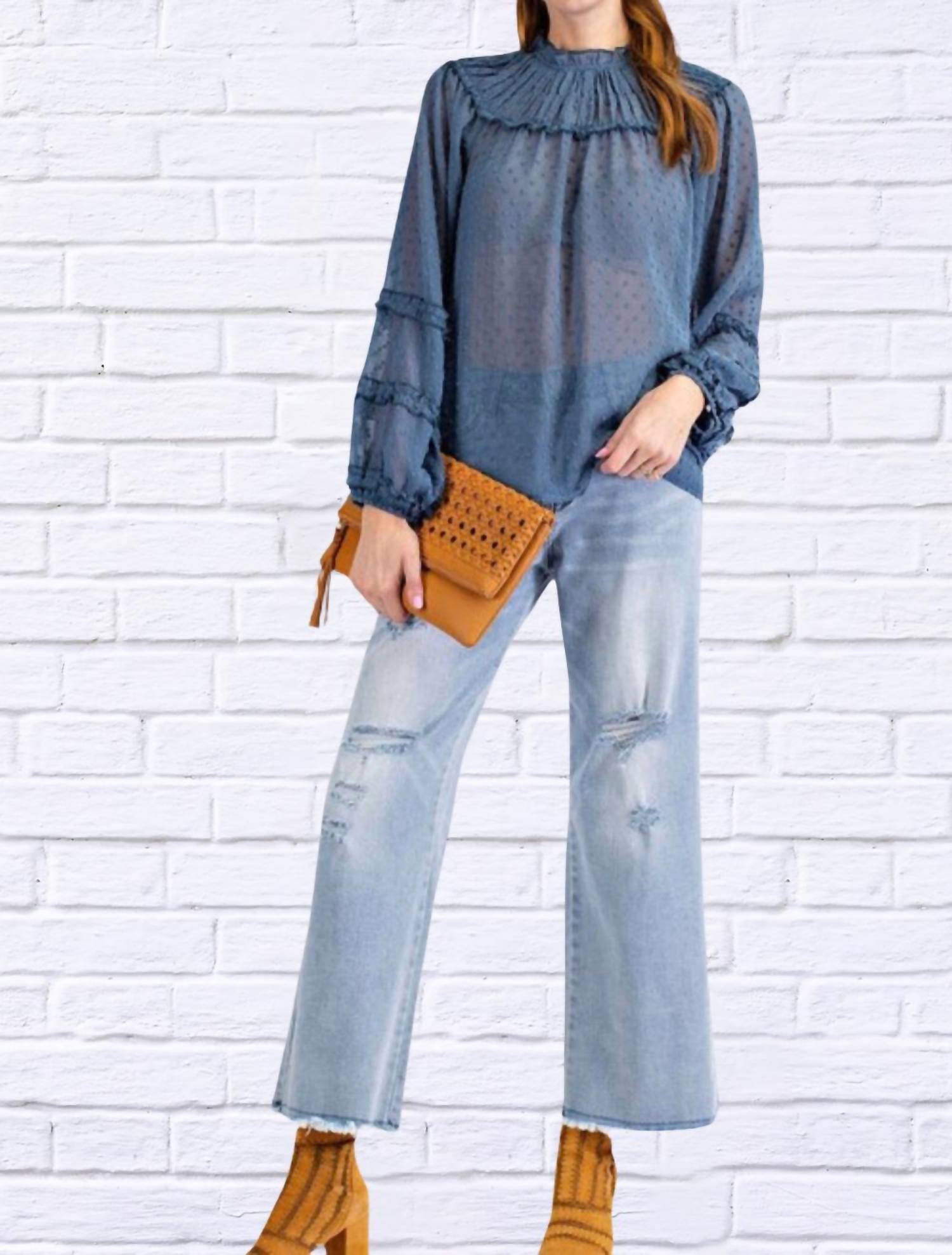 Introducing the Dawn Chiffon Blouse by Easel, a delightful piece that exudes femininity and fun. This denim-colored blouse features long sleeves and a mockneck design, crafted from 100% polyester with a textured pattern. Button closure. Dry clean only.