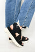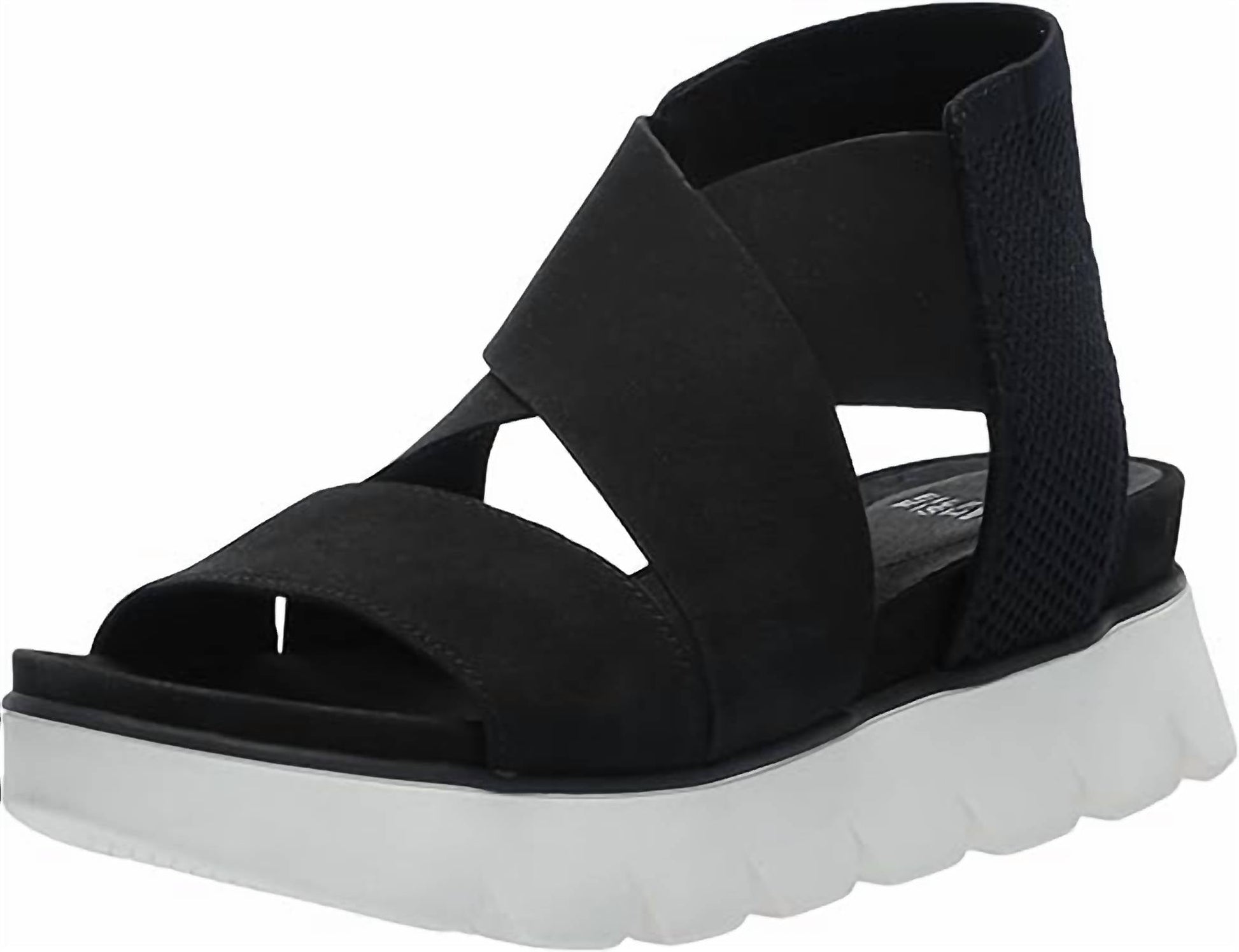 Step into both elegance and comfort with the Women's Chant Wedge by Eileen Fisher, available in sophisticated black. Crafted from tumbled nubuck leather, these sandals feature a 2-inch wedge heel and 1-inch platform, making them perfect for any occasion. The open toe design with crisscross straps and slip-on construction offers both style and ease of wear, enhanced by a molded footbed and recycled polyester stretch knit at the back. A rubber outsole provides excellent traction and flexibility, ensuring comfort with every step.