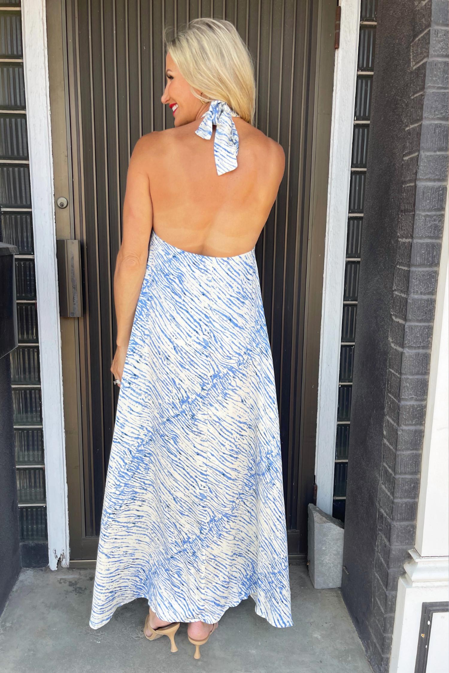 Elevate your wardrobe with the Sahara Maxi Dress by ELAN, a perfect embodiment of carefree style in a stunning blue hue. This patterned, sleeveless maxi dress boasts a breezy A-line silhouette with a halter neckline and a keyhole opening, ideal for elegant evening events or a day out. The tie closure around the neck adds a playful touch, crafted from 100% modal for a soft and breathable feel. Care for it easily with machine wash cold, tumble dry, and low iron.