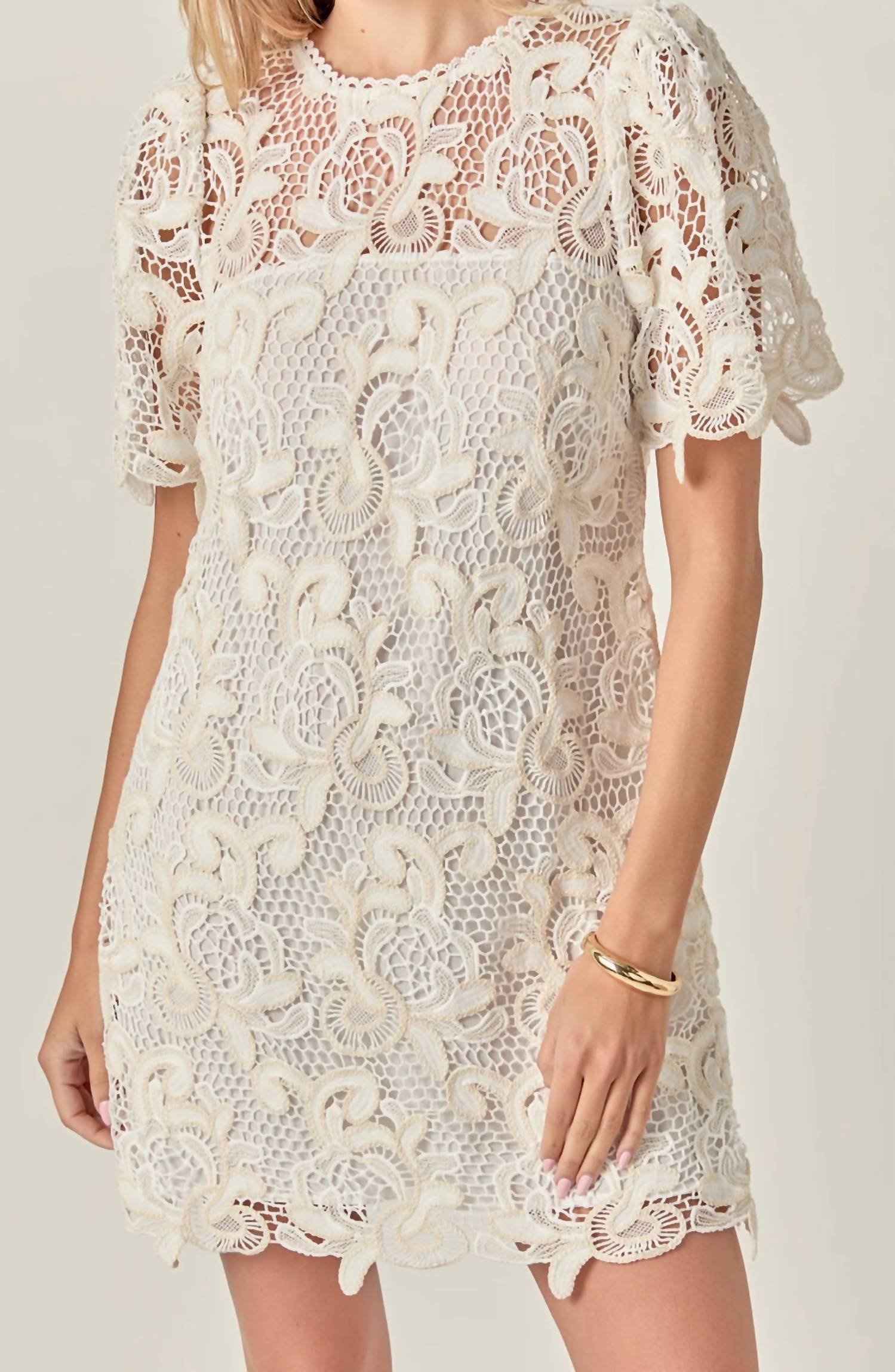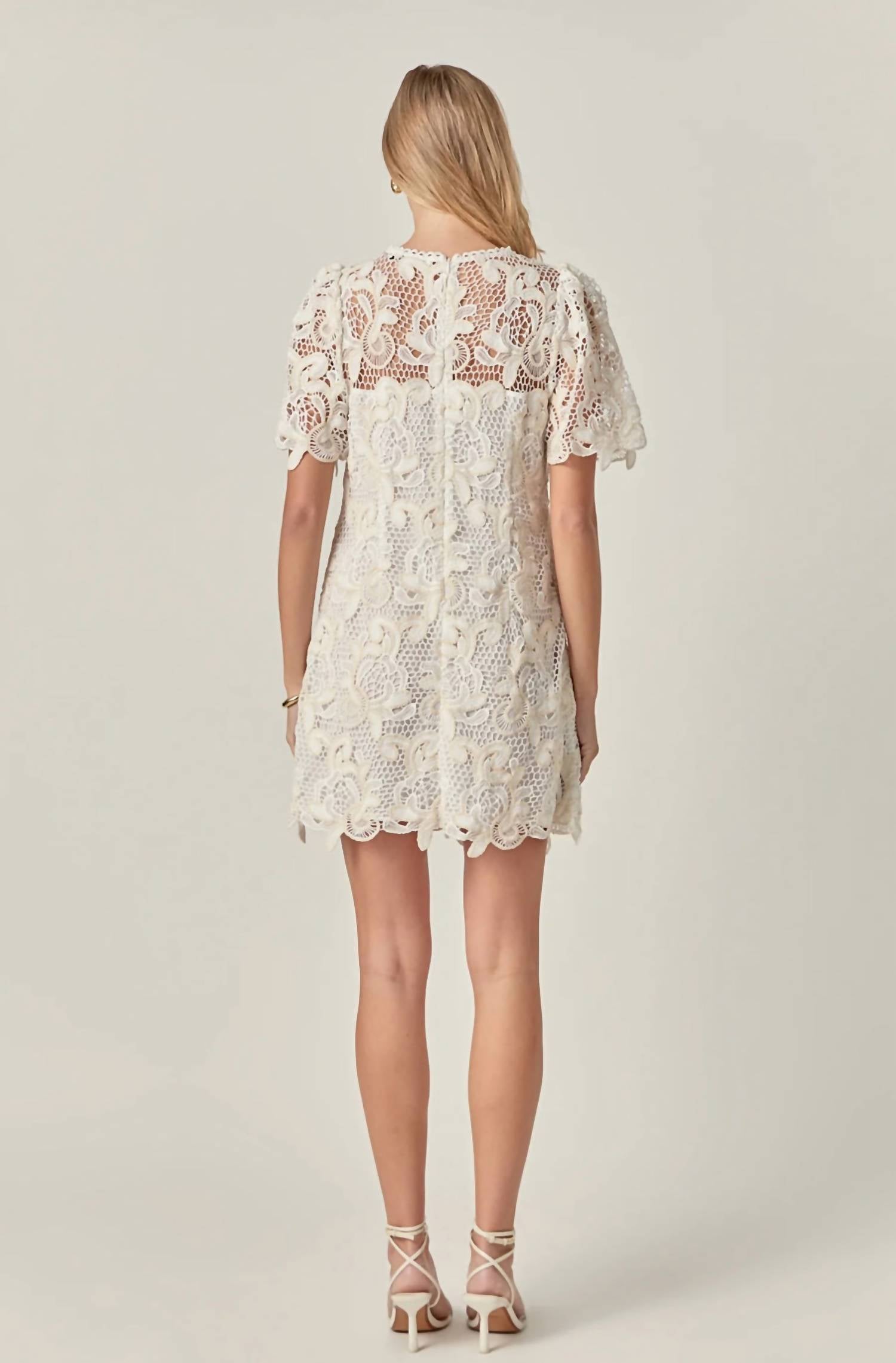 Step into sophisticated style with the Women's Camille Mini Dress by English Factory, a Boho Chic staple in timeless white. This shift dress offers short sleeves and a crewneck, featuring exquisite lace embroidery to add a touch of romance. The 100% polyester shell and lining ensure a comfortable fit, enhanced by a back invisible zipper and partially lined design for additional comfort. Perfect for a summer getaway or an elegant evening, this piece fits seamlessly into your wardrobe essentials. Model is wearing a size small (5'10" height, 33" bust, 25.5" waist, 35" hips).