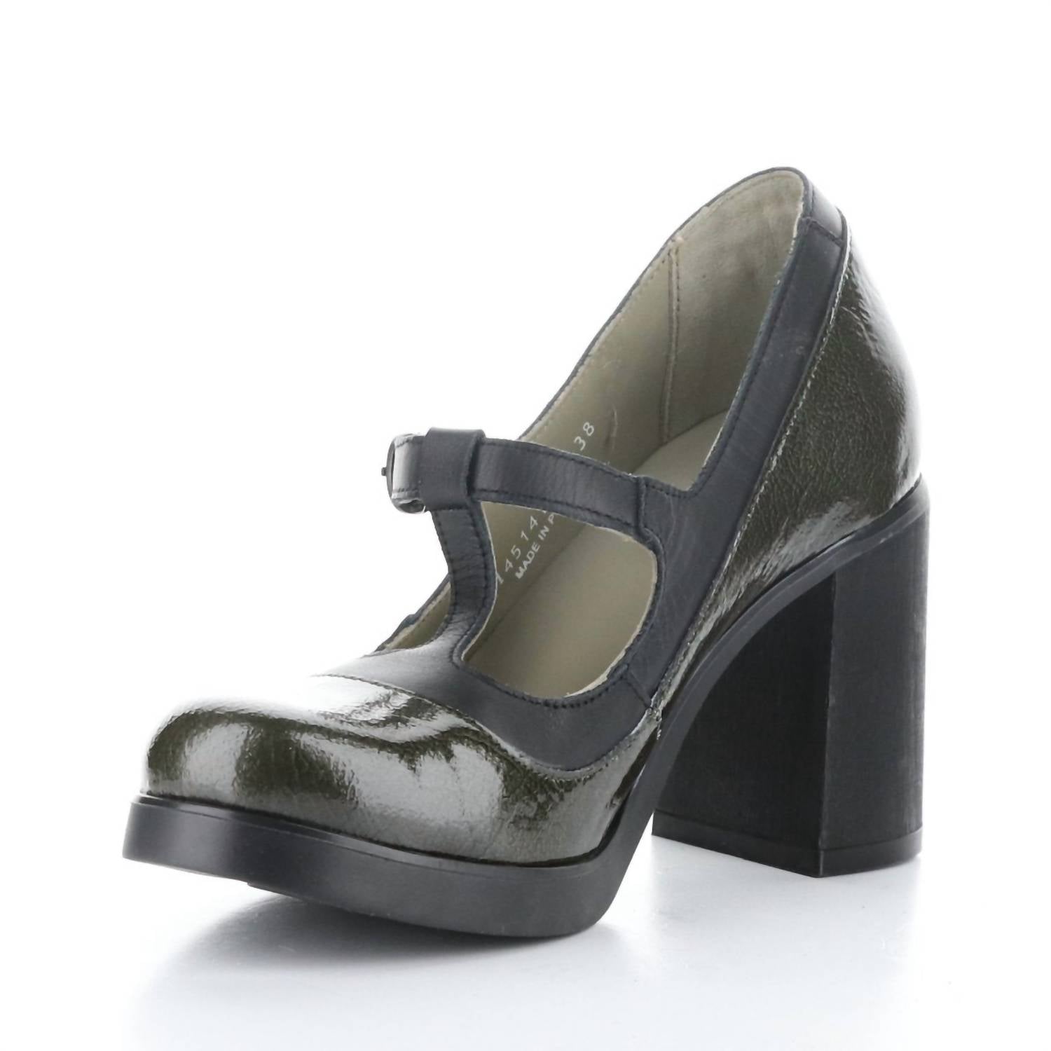 Step into style with the Women's Seif T-strap Pump by FLY LONDON, a chic choice in Military Black. Crafted from luxurious leather, these pumps are lofted on a high 3.75" block heel and feature a 3/4" platform for added comfort. Made in Portugal, they boast a round toe and a medium shoe width, with an adjustable strap and buckle closure to ensure the perfect fit.