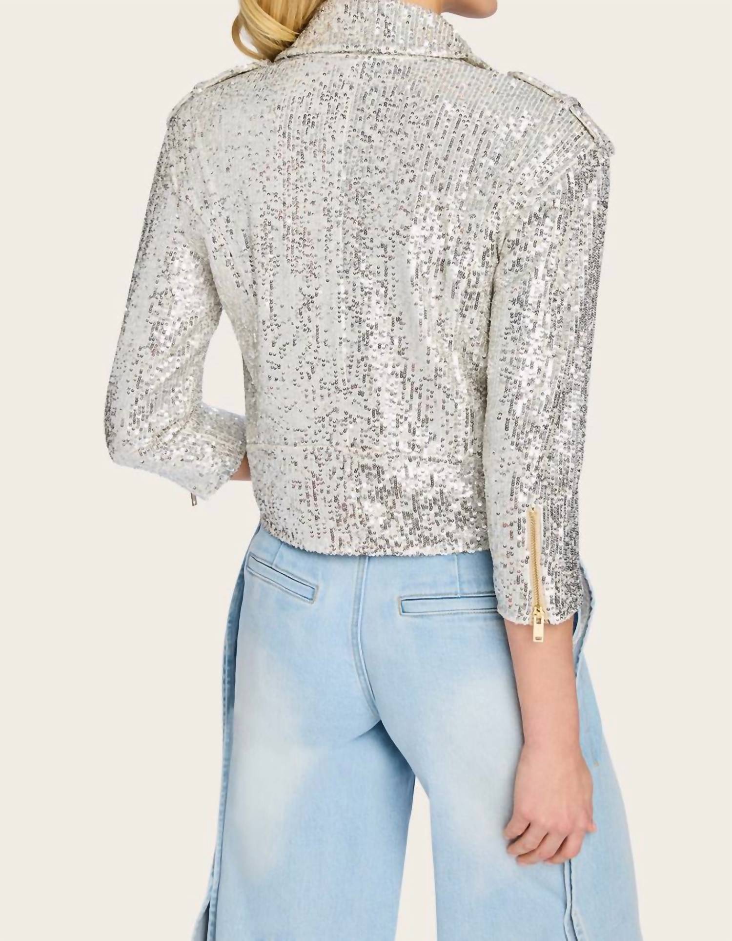 Make an audacious fashion statement with the Crawford Sequin Moto Jacket by Generation Love in Moonbeam. This jacket features three-quarter sleeves and a cropped length of 19 inches for a modern, edgy look. Crafted from self and lining materials of 95% Polyester and 5% Elastane, it boasts a shimmering sequin finish with a convenient zip closure. Care for this eye-catching piece with professional dry cleaning for best results, and consider sizing down as the style runs big.
