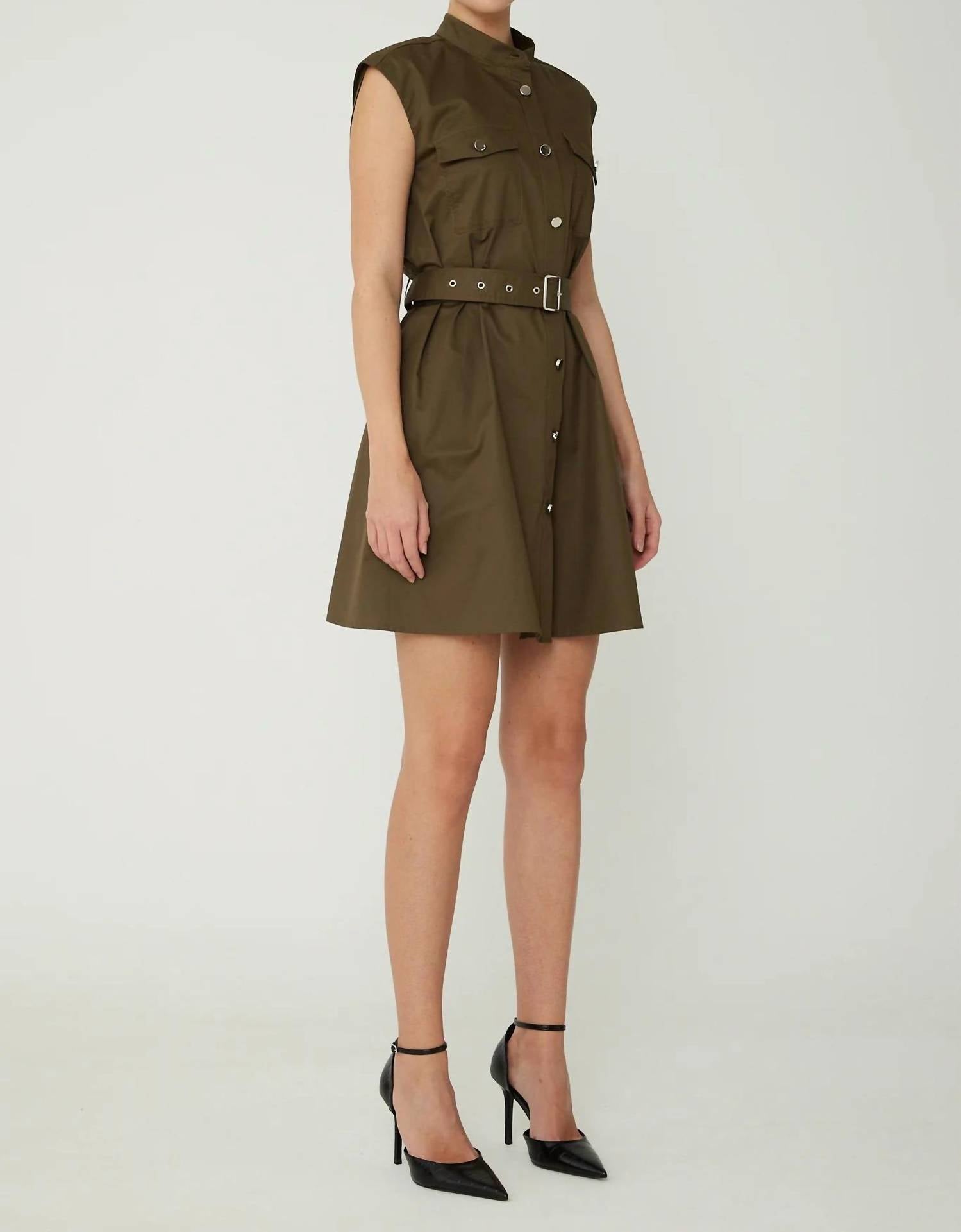 Elevate your wardrobe with the Barbara Mini Dress by JS Boutique, a perfect blend of sporty elegance in a stunning olive shade. This sleeveless, A-line dress features a collar neckline and a utilitarian touch with included pockets and a belt. Crafted from 100% cotton, its unlined, loose fit can be easily adjusted with its front button closure to match any occasion, from dinner parties to casual outings. Care: Dry clean only.