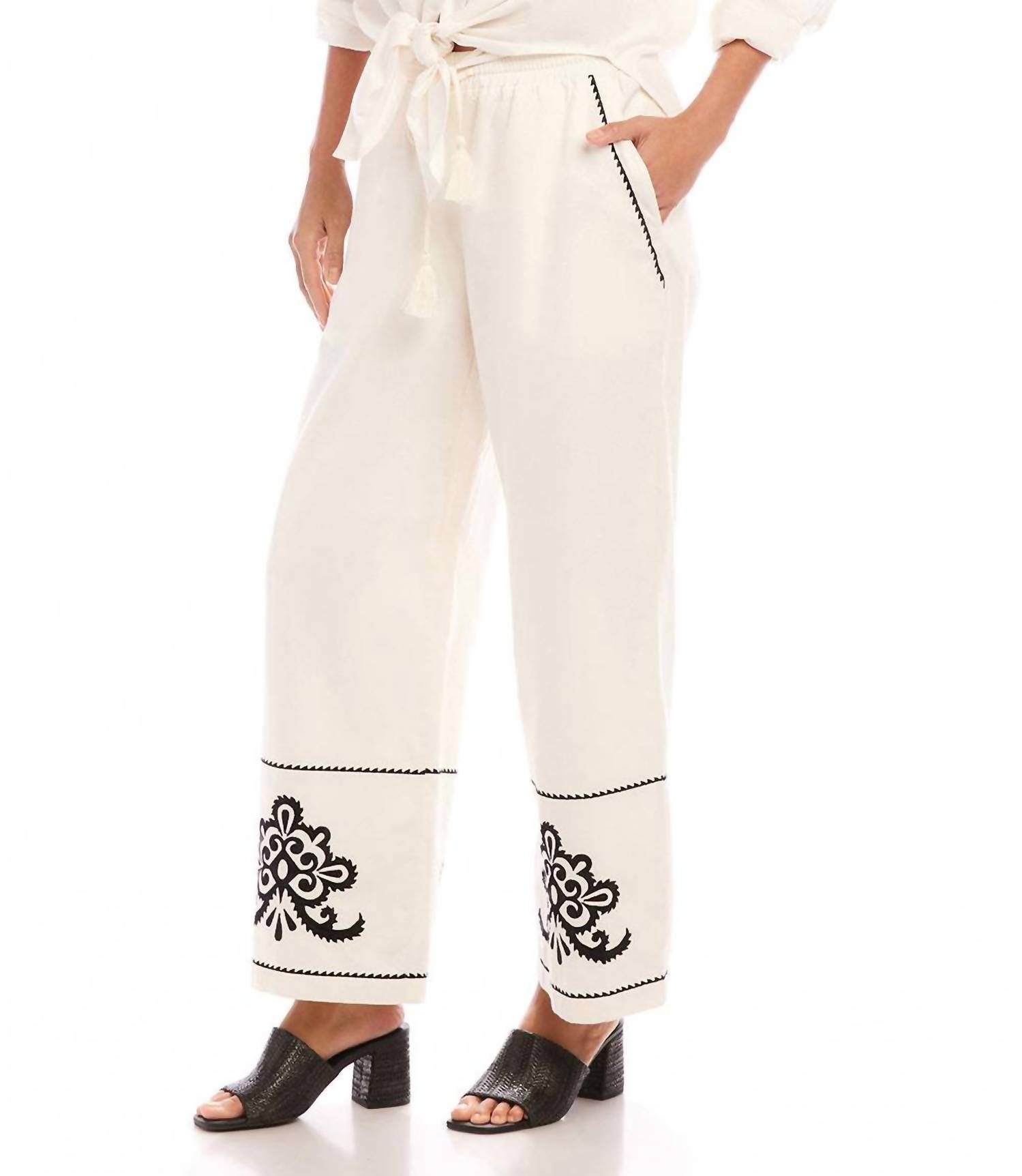 Enhance your wardrobe with this trendy cropped number, designed to blend style and practicality. The comfortable fit allows for easy all-day wear. The perfect length to pair with your favorite mules. Introducing the Embroidered Drawstring Ankle Pants by Karen Kane, a sophisticated addition to your spring/summer wardrobe. These cream colored, high-rise pants are crafted from 100% cotton and boast intricate black embroidery detail. They feature an elasticized waist with a drawstring closure, a comfortable wide-leg fit, and side pockets for convenience. Length: Ankle; Inseam: 28.25 inches; Front rise: 11 5/8 inches (size M). Imported and fully lined, they are easy to care for and maintain with a hand wash cold and line dry.