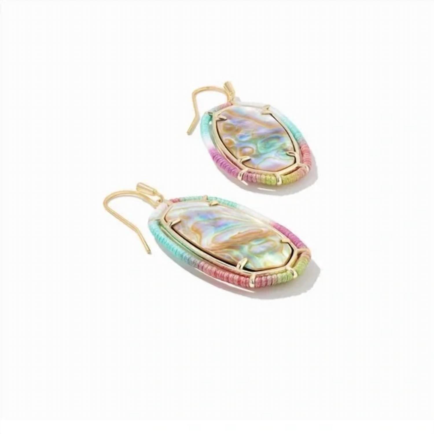 Add a splash of color to your wardrobe with the Women's Threaded Elle Drop Earrings by Kendra Scott. These earrings are inlaid with genuine custom-cut shells encircled by a colorful, hand-wrapped frame for a textured, handcrafted look. Made with 14k gold plated over brass, these earrings measure 1.65 inches in length and 0.83 inches in width, featuring a pastel mix of glass-plated iridescent abalone and ombre cord. The easy-to-wear earwire closure ensures they are a breeze to add to your everyday style.