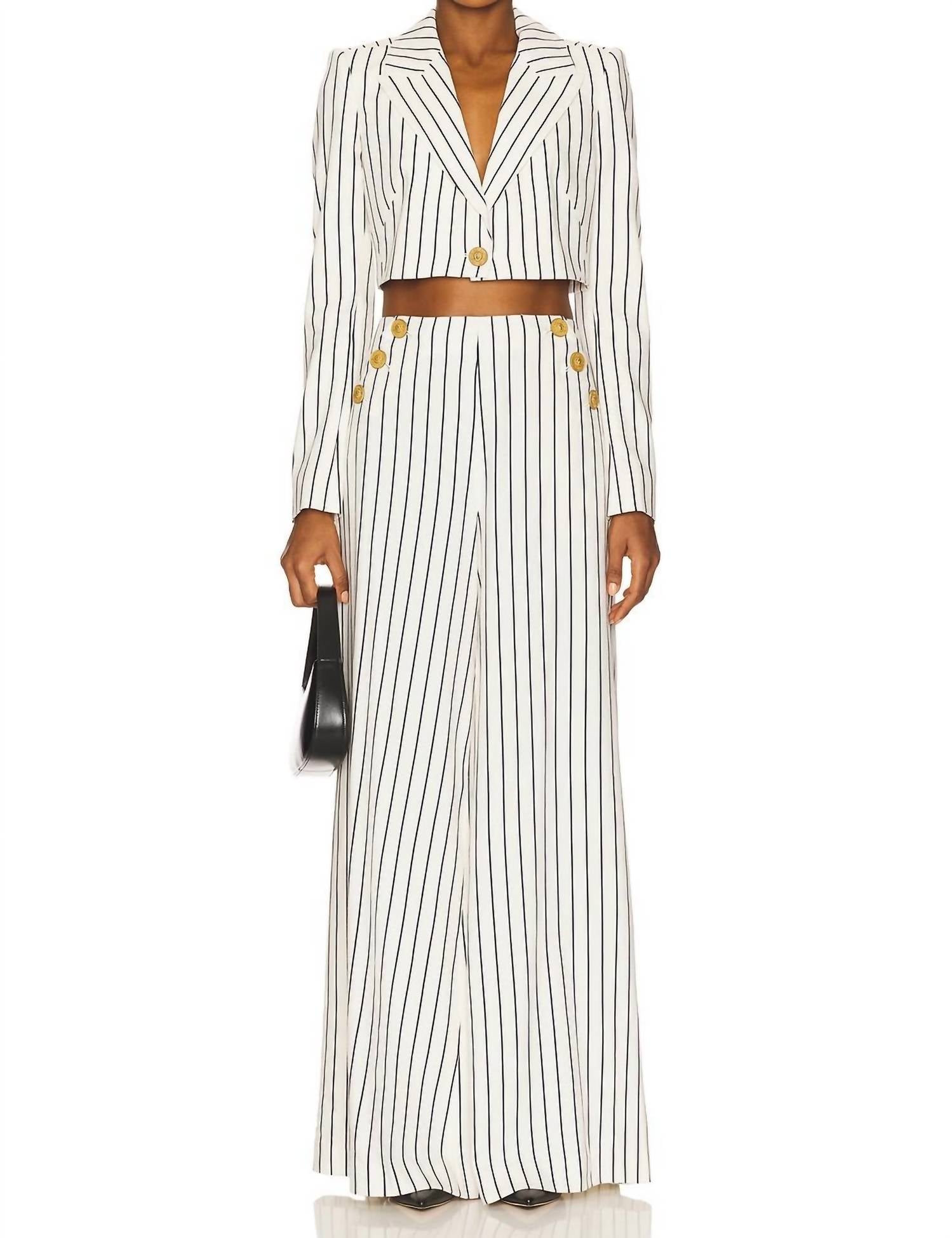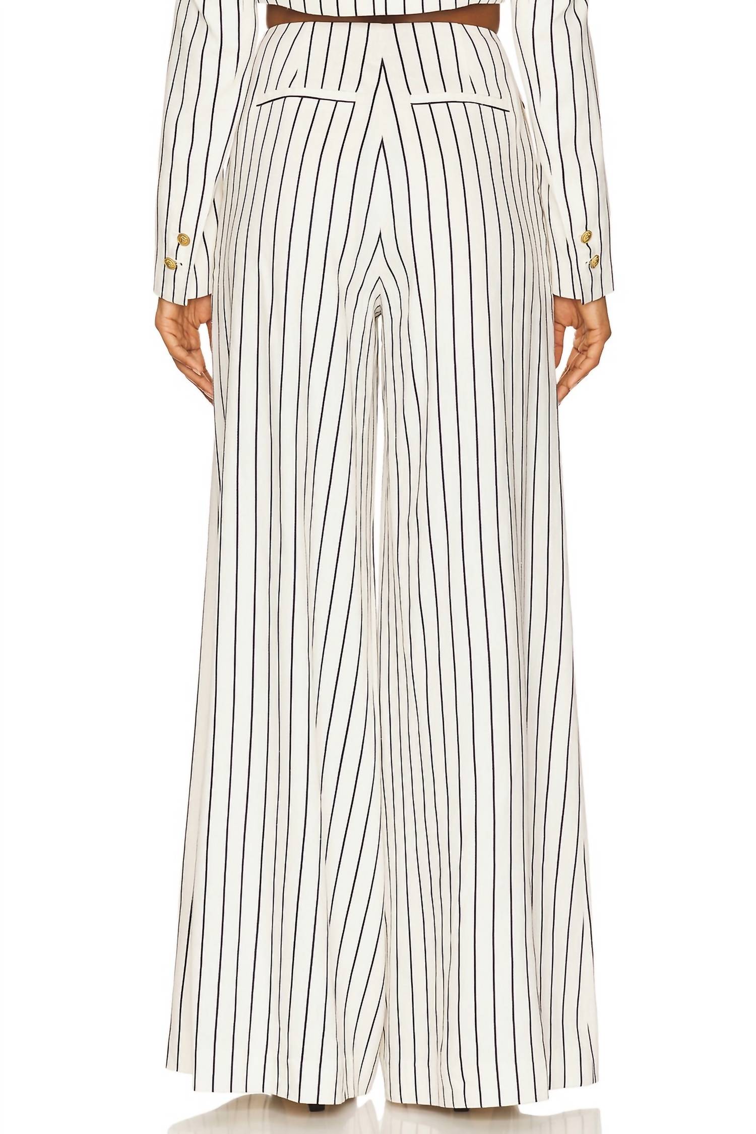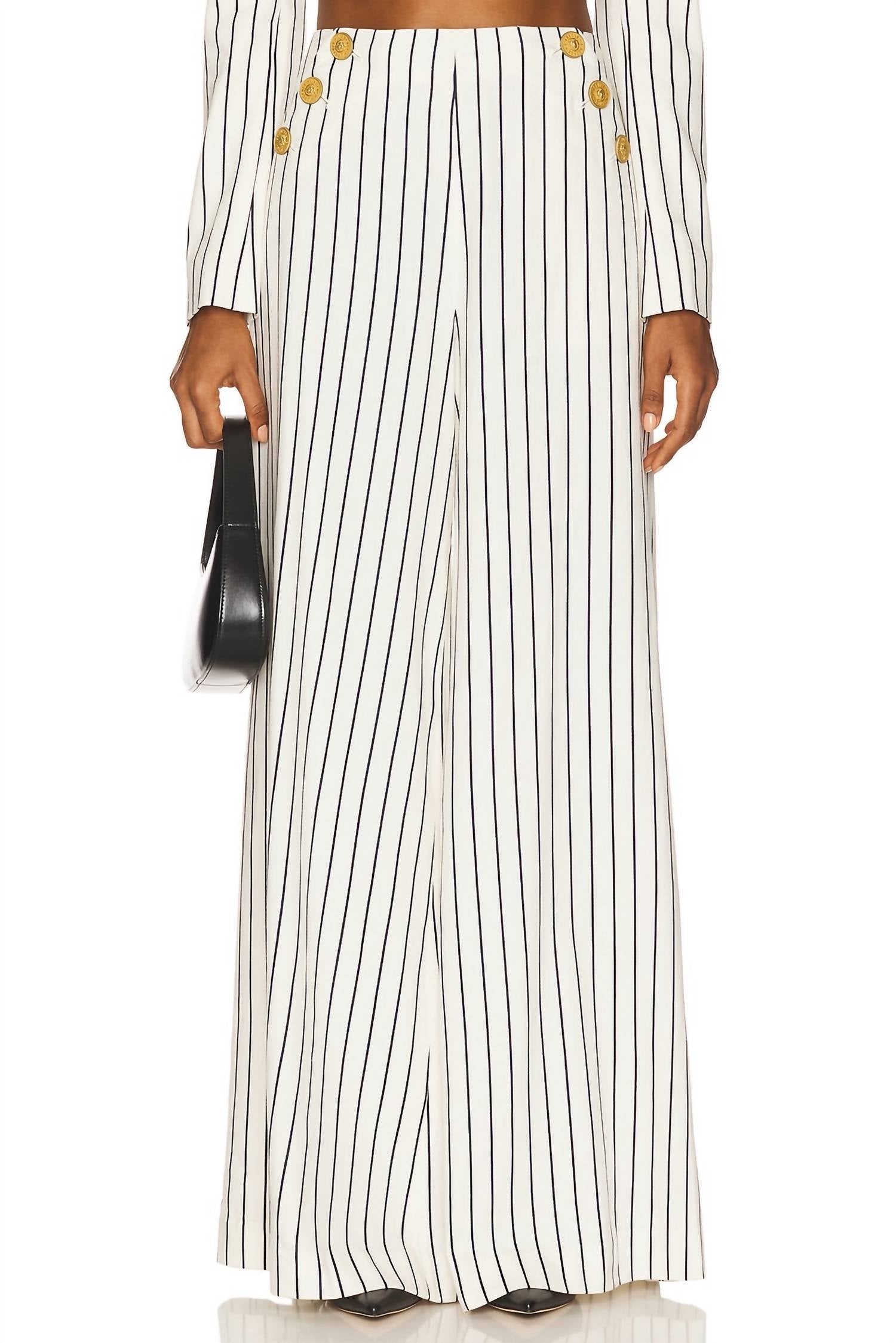 Elevate your wardrobe with the Kingston Striped Wide-leg Pant by L'Agence, perfect for both workwear and elegant occasions. Crafted from a high-rise linen-cotton blend in vintage white with black stripes, these trousers offer a flattering relaxed fit and ultra wide-leg design. Accented by striking gold lion head buttons, they feature side and back welt pockets for practicality. Closure: Button closure. Care: Dry clean only.