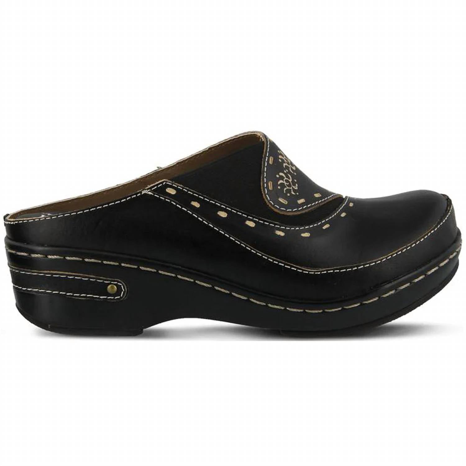 Elevate your footwear collection with the Women's Chino Leather Clog by L'Artiste, boasting a stunning open-back design in sleek black. This clog combines hand-painted leather uppers with intricate stitching and a unique embossed floral motif. Featuring a comfortable synthetic leather lining and a textile-padded insole, it offers all-day comfort, while the leather-pieced heel provides a stylish touch. With a stable polyurethane outsole and a 2-inch platform heel, this clog ensures both style and practicality.