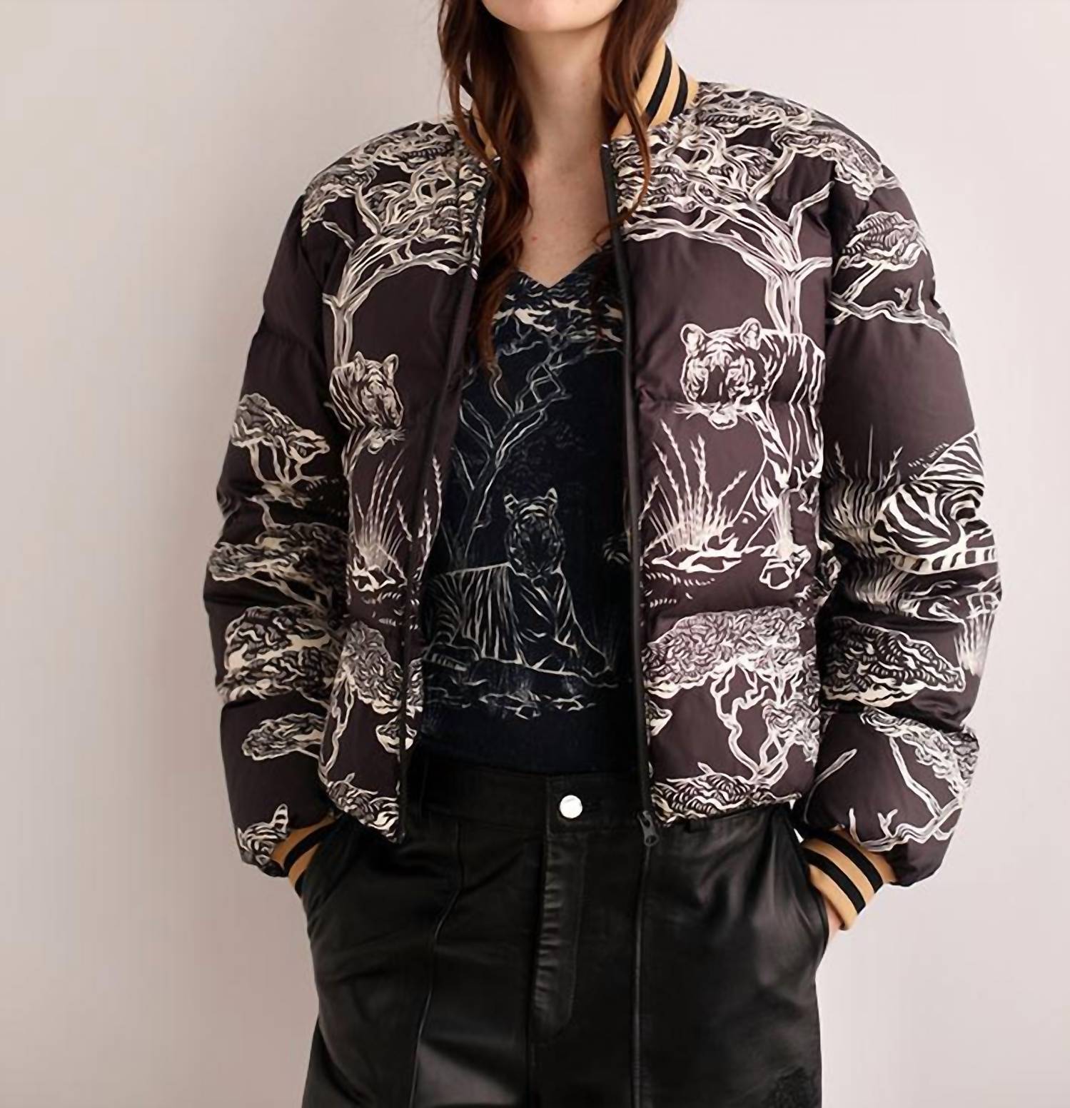 Introducing the Safari Puffer Jacket by Las Sureñas, a winter essential for women in striking Safari Black Print. This long sleeve, patterned jacket is crafted from durable nylon, ensuring warmth and style for your travels. The quilted design provides insulation without bulk, and a zip closure allows for easy wear. Featuring two zippered side pockets, it's perfect for keeping hands warm or storing essentials on the go.