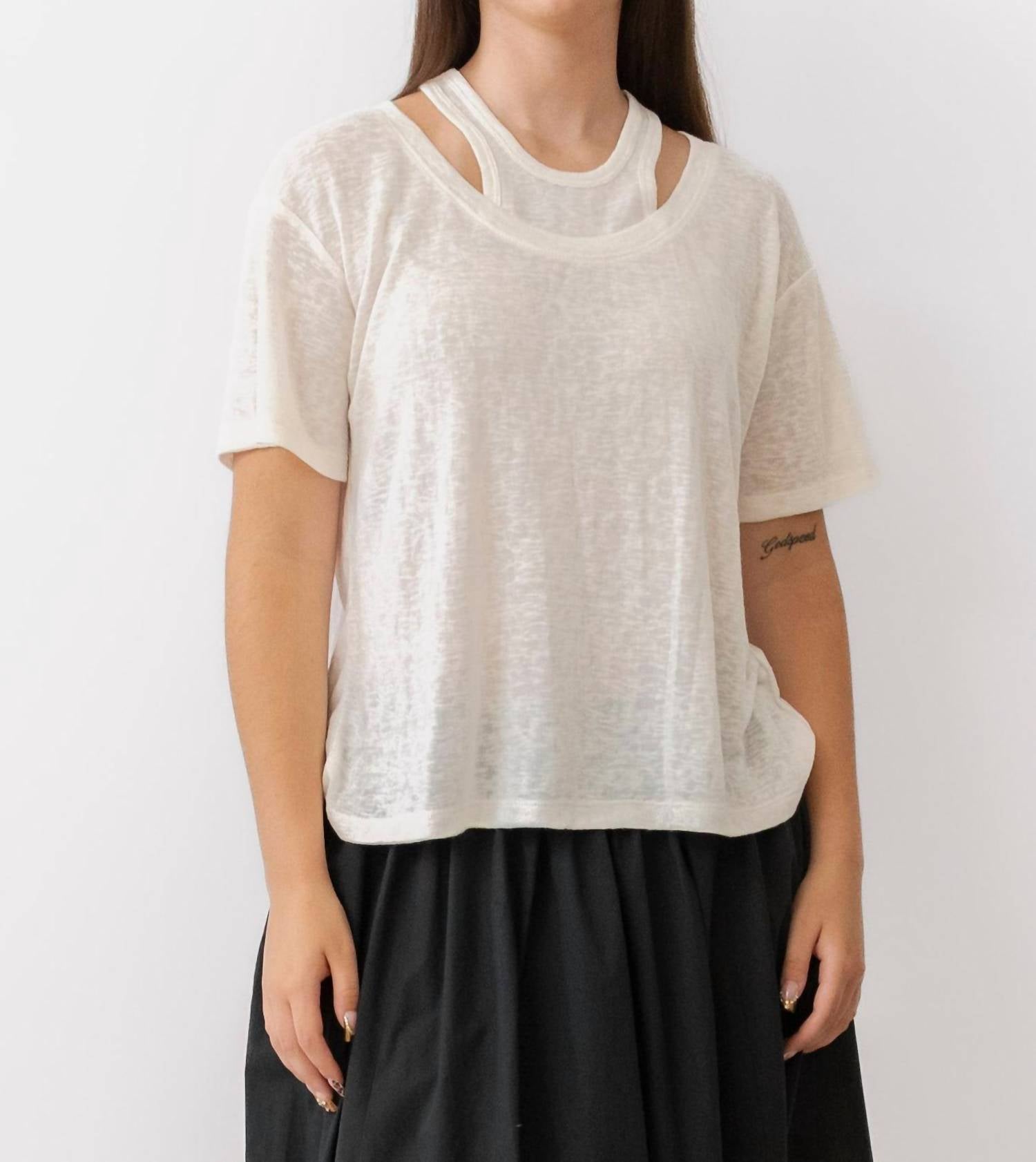 Introducing the Walker Tee by LNA, a chic ivory short sleeve top that seamlessly blends comfort and style with its super soft brushed jersey fabric and unique double-layered racer cutout design. Designed with a relaxed fit and crewneck silhouette, this tee is ideal for a minimalist summer wardrobe. Composition: 60% Rayon, 40% Polyester. Closure: Pull on. Care: Machine wash cold on a gentle cycle, lay flat to dry. The model is 5'9.5" and wearing a size small. Designed in Los Angeles using imported fabric.