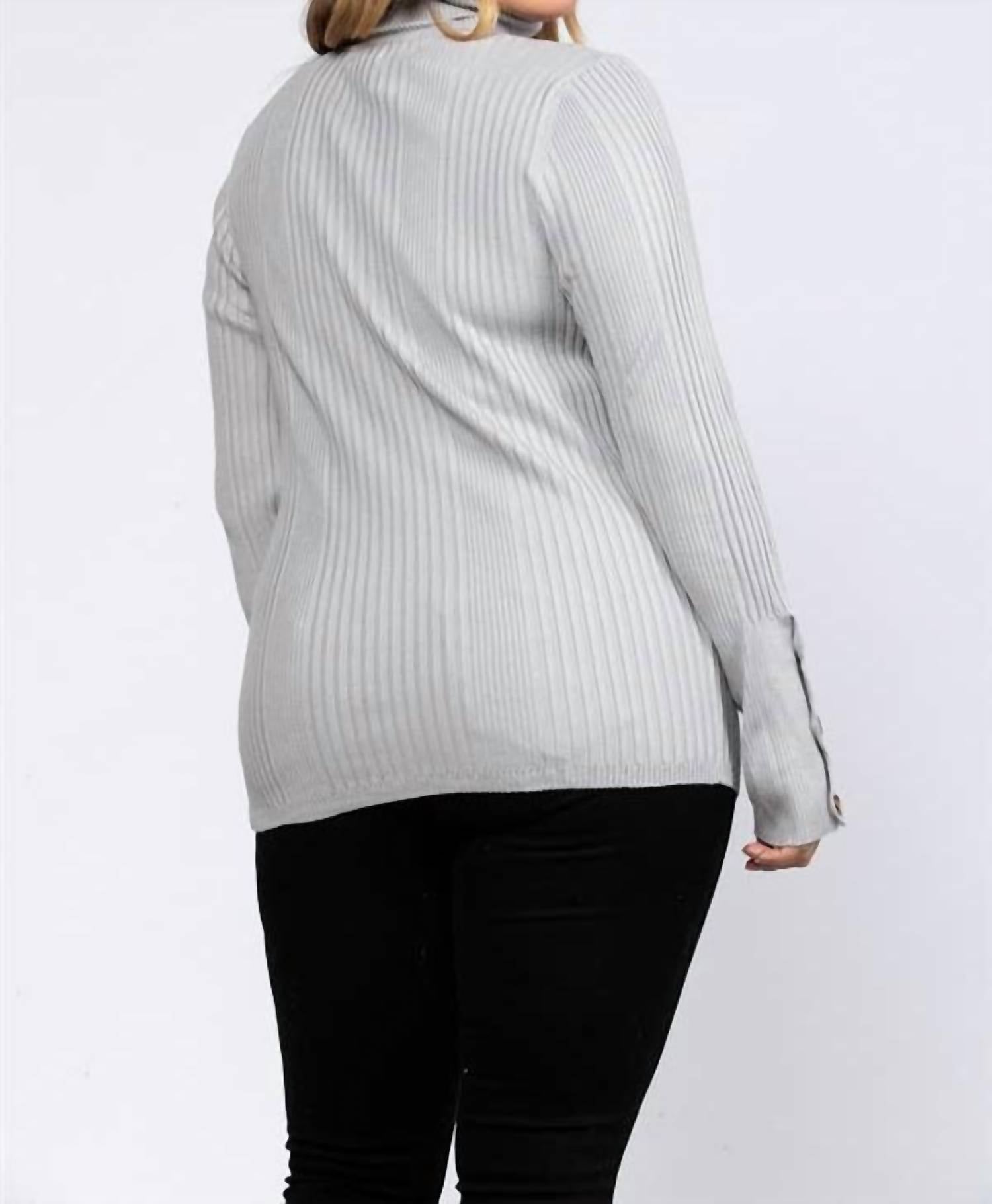 Fit to perfection and effortlessly chic. Elevate your fall style with the &Merci Rib Stitch Pullover Sweater in classic gray, an essential for your wardrobe. Featuring long sleeves and cuffed button details, it offers warmth and comfort with its cozy turtleneck design. Crafted entirely from 100% cotton, this sweater embraces a minimalist textured pattern, tailored specifically for plus sizes 1X-3X, and proudly made in China. Ideal for a vacation getaway, it effortlessly combines comfort and style with a button closure for easy wearing.