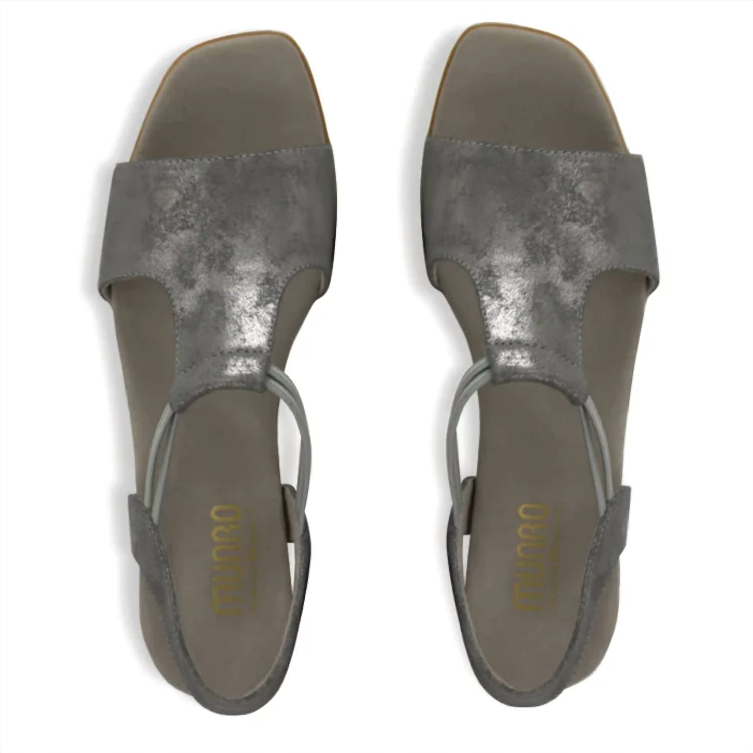 Step into elegance with the Women's Susan Sandal by Munro, designed in a striking Basalto/gunmetal color. This T-strap sandal features a wide-band vamp strap and stretch cross straps for a secure fit, complemented by a squared toe and block heel. The upper is crafted from soft leather with a shimmer print, lined with microfiber, and includes a wrapped padded insole with a riveted steel shank for stability. The 1.50-inch low heel height is perfect for an evening event, ensuring both comfort and style with its latex rubber outsole.