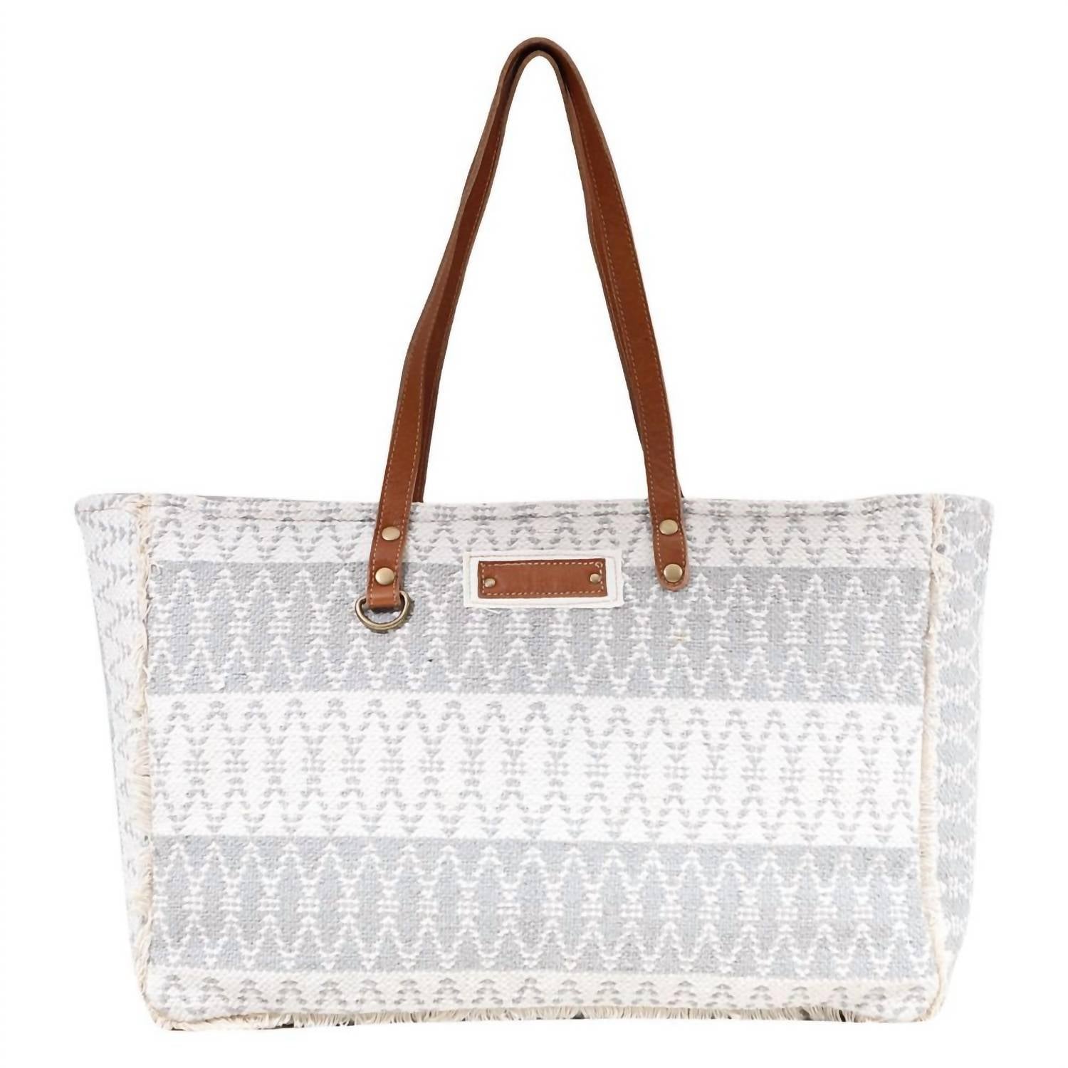 Introducing the Myra Bags Women's Snowy Weekender Bag in elegant beige, crafted from smooth and breathable canvas. Sized at 19" width, 6.5" depth, and 12.5" height, this shoulder bag features a large main compartment with a secure zip closure. It includes an extra roomy interior, ideal for family or long-distance travels, along with leather top handles measuring 12.5" for versatile carrying. Perfectly suited for those who appreciate both style and function.