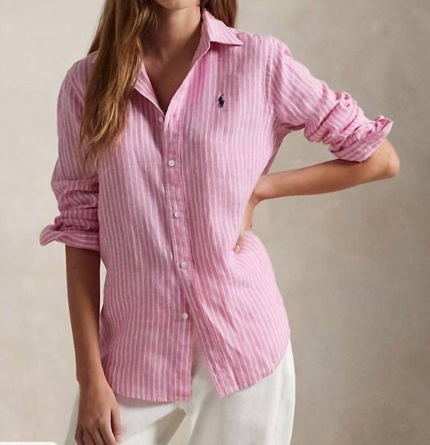 A classic button down shirt that will never go out of style. This version of our Classic Fit shirt is woven with breathable linen and yarn-dyed for a vertical striped motif. Our signature embroidered Pony accents the chest. Classic Fit: a straight silhouette. Intended to hit at the hip. Size medium has a 28.25" front body length and a 33" sleeve length. Body length and sleeve length are taken from the center back of the neck. Sleeve length changes 0.75" between sizes. Spread collar. Buttoned placket. Long sleeves with buttoned barrel cuffs. Signature embroidered Pony at the left chest. Shirttail hem. Box-pleated back yoke. 100% linen. Machine washable or dry clean. Imported. Model is 5'10" (178 cm) and wears a size small.