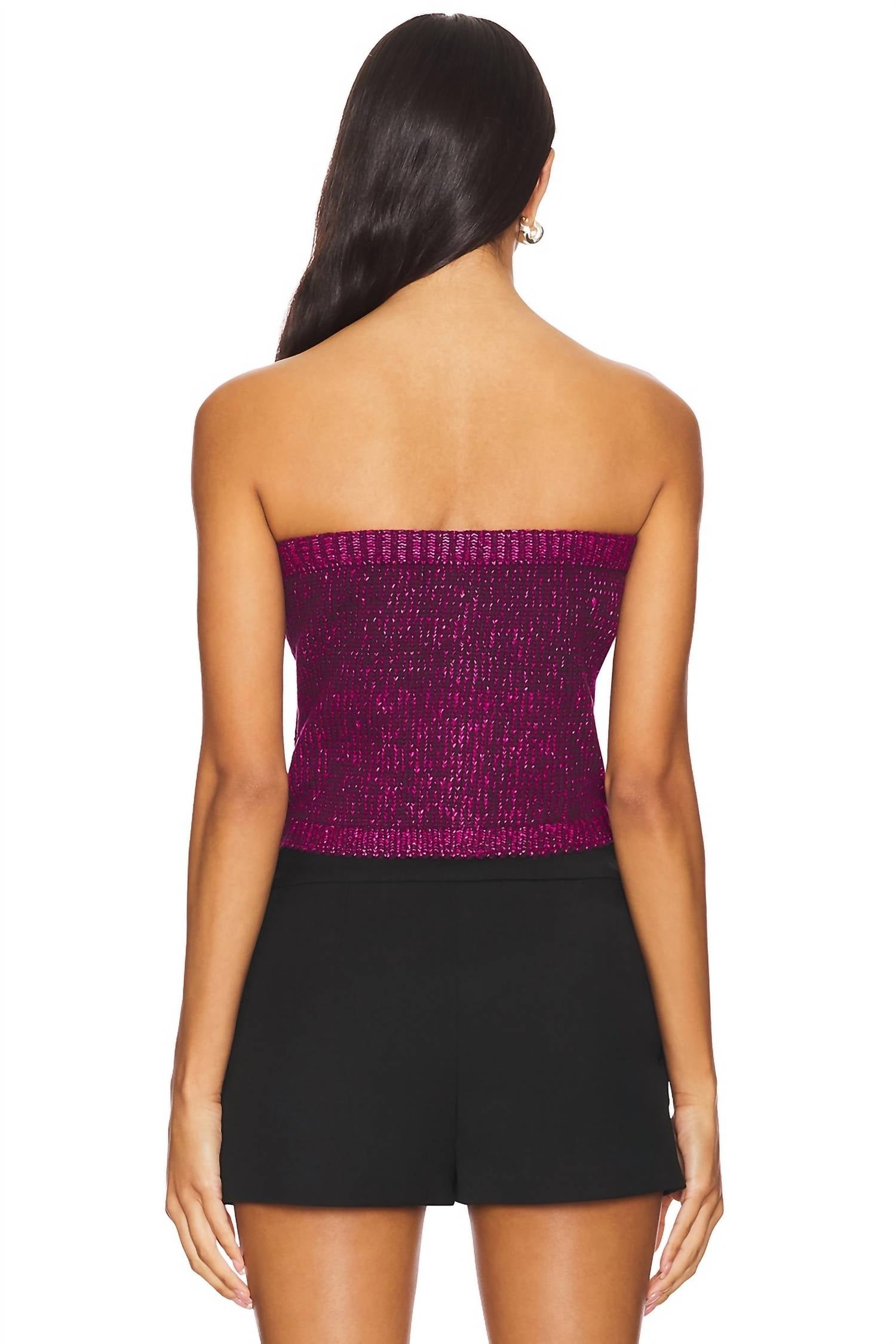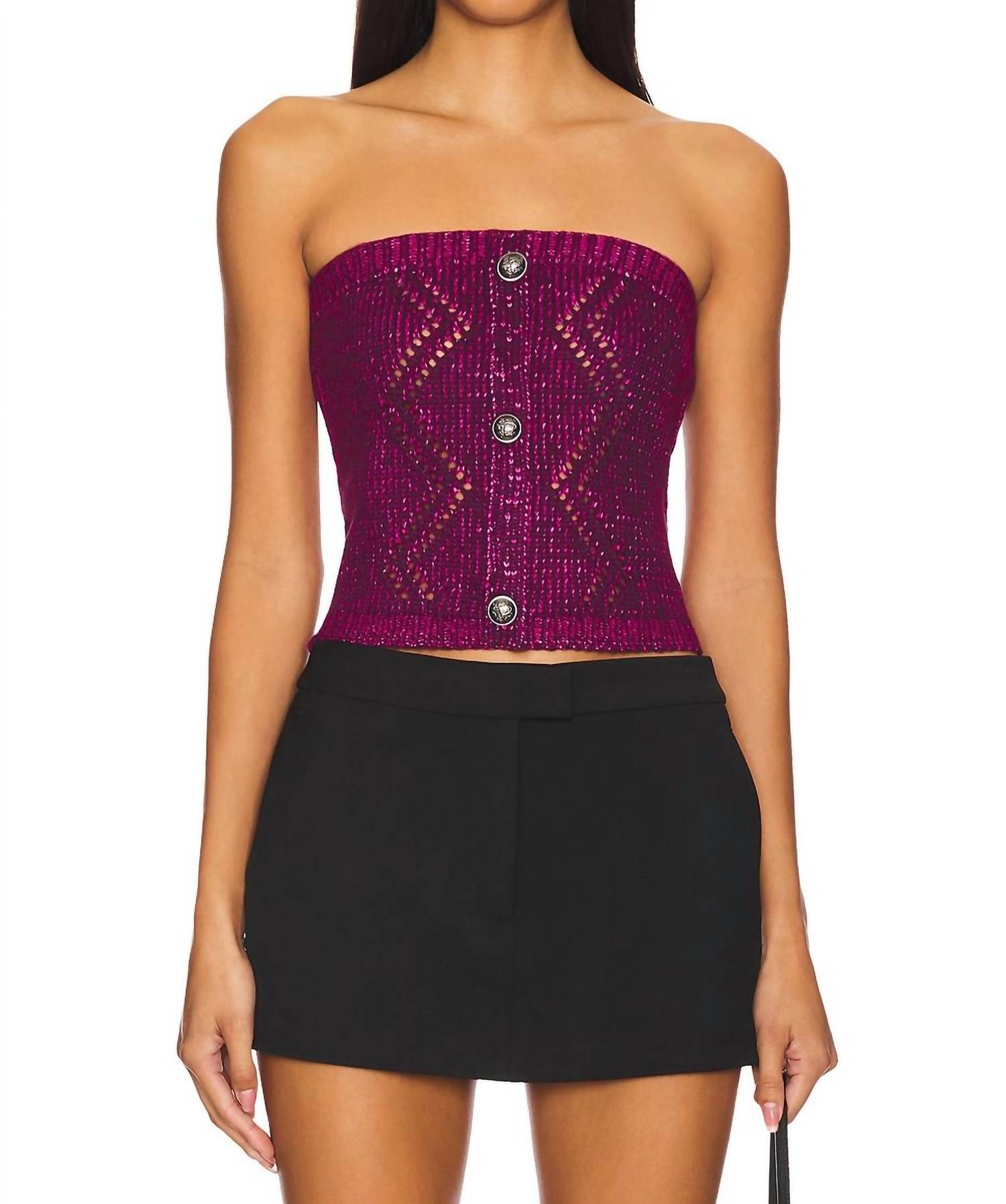 Elevate your spring wardrobe with the Nadira Sweater Top by STEVE MADDEN, a textured, off-the-shoulder piece in a rich aubergine hue. This strapless midweight knit features a ribbed hem and a stylish front button detailing for a touch of quiet luxury at your next dinner party. Crafted from 100% polyester and made in China, its pull-on style ensures ease of wear. Care instructions include hand washing to maintain its elegant look.