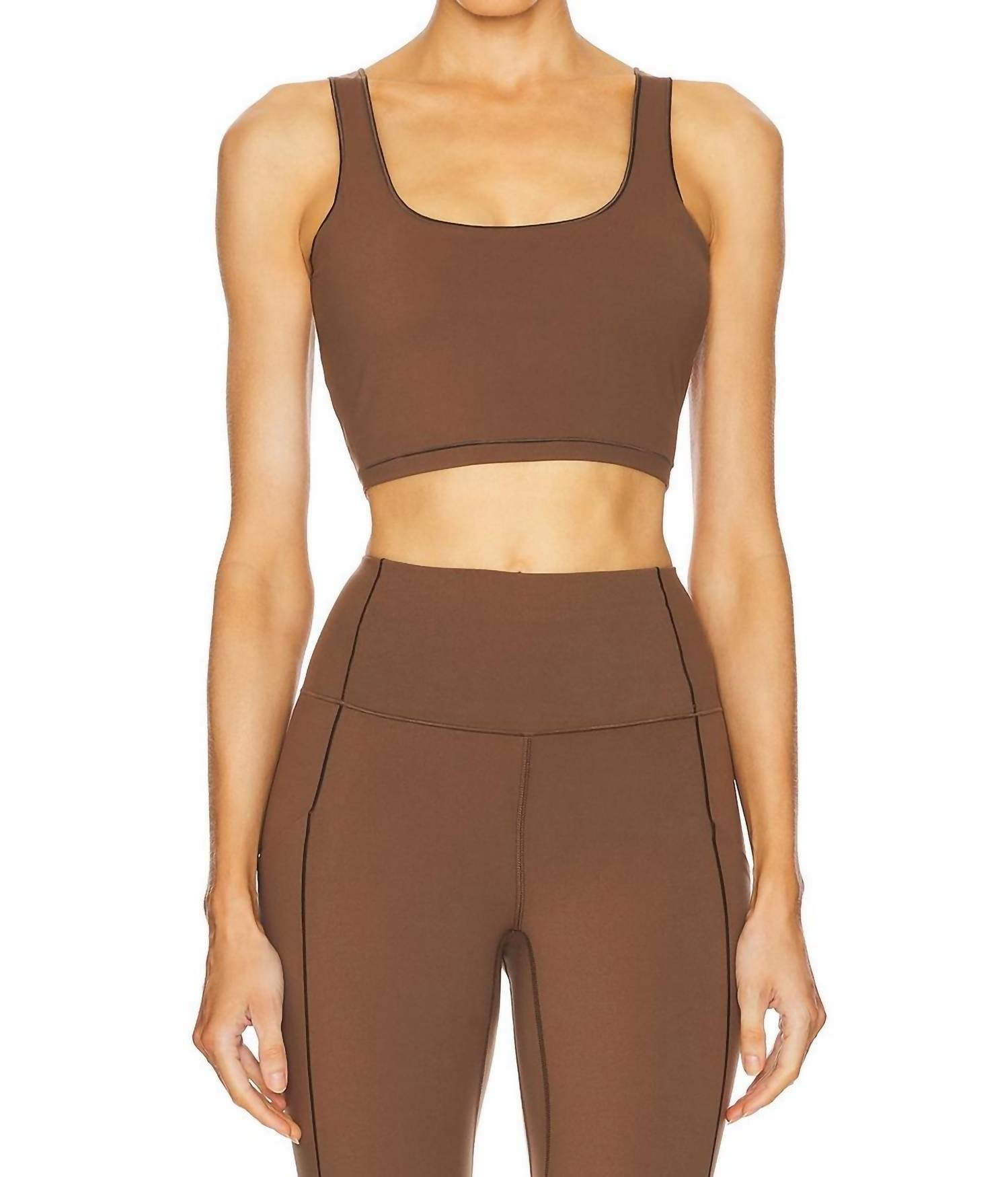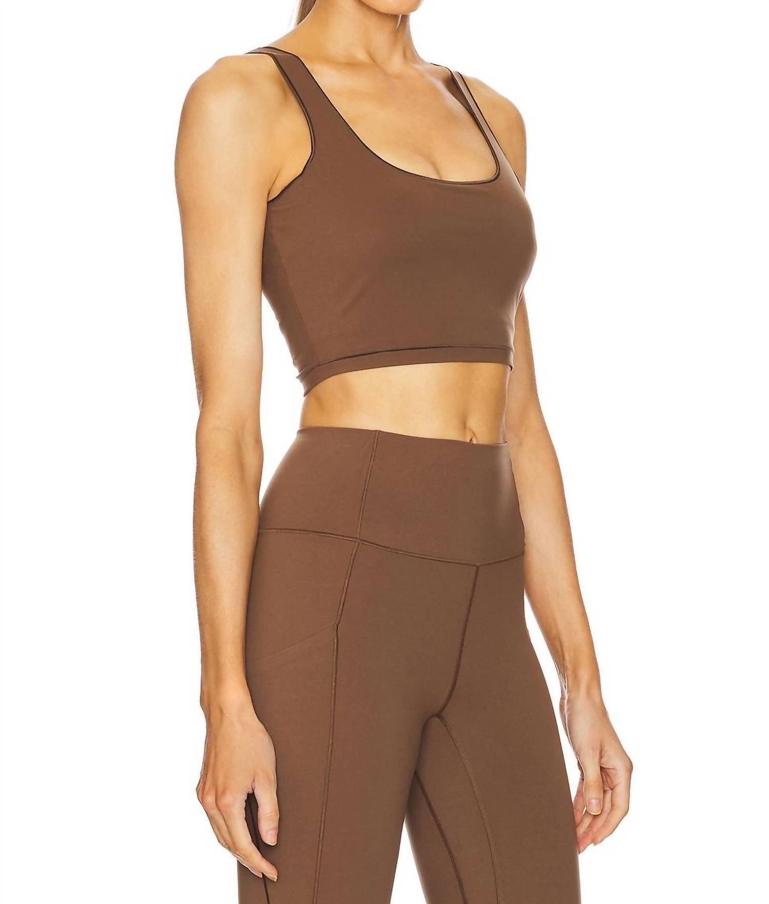 Introducing the Shape Dayton Bra by VARLEY, the perfect companion for your fitness or workout sessions in the elegant Carob shade. This sports bra combines comfort and support with a shelf bra featuring padded cups, crafted from a blended fabric of 62% polyamide and 38% elastane, lined with 77% nylon and 23% elastane. Made in Vietnam, it features a subtle logo detail on the back. Care instructions are simple: machine wash and lay flat to dry, ensuring easy maintenance for your active lifestyle.
