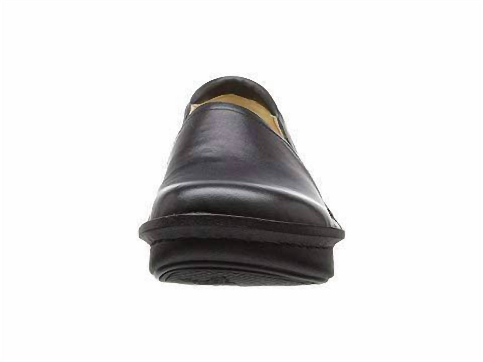 Experience superior comfort with the Women's Debra Slip-resistant Nursing Shoe by Alegria, crafted in genuine black nappa leather. This sneaker features elastic for a secure fit and a lab-rated slip-resistant outsole with a stain-proof leather coating. The leather-covered, memory foam footbed provides superior arch support and breathability, with a removable insole for custom orthotics. Crafted with a mild rocker outsole and a roomy toe box, this shoe has a heel height of 1 ¾ inches and a platform height of 1 ¼ inches, making it ideal for both casual wear and demanding occupational settings.