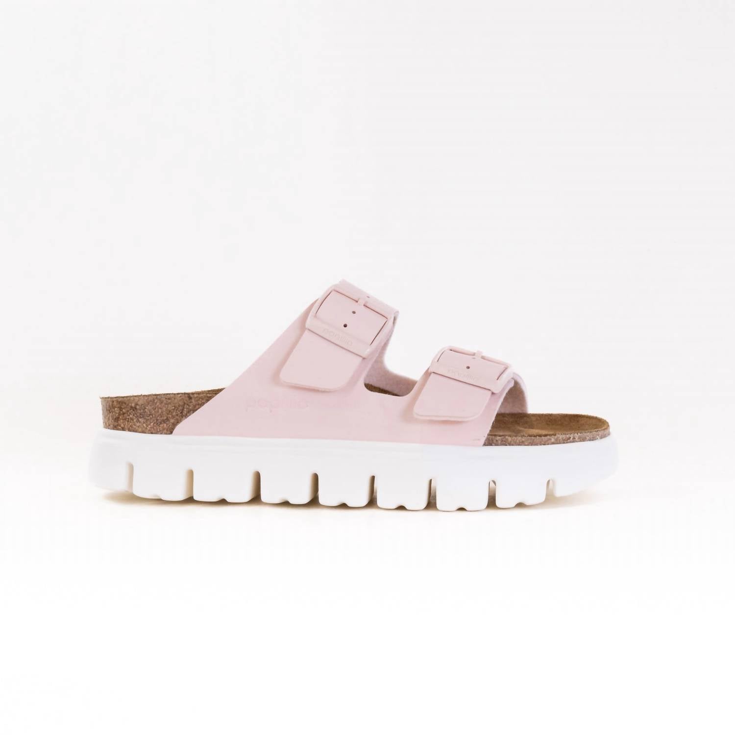 Cute, functional, and comfortable. These sneakers check all the boxes. Step into summer with the Women's Papillo Arizona Chunky Sandals by Birkenstock in a chic light rose. These sandals feature a suede upper and an anatomically shaped cork-latex footbed for exceptional comfort, paired with a microfiber lining for a soft touch. Their standout element is the chunky, lightweight EVA platform midsole, with a 30 mm heel providing a minimalist yet stylish lift. The double strap with adjustable pin buckle ensures a secure fit, made proudly with the renowned footbed "Made in Germany."
