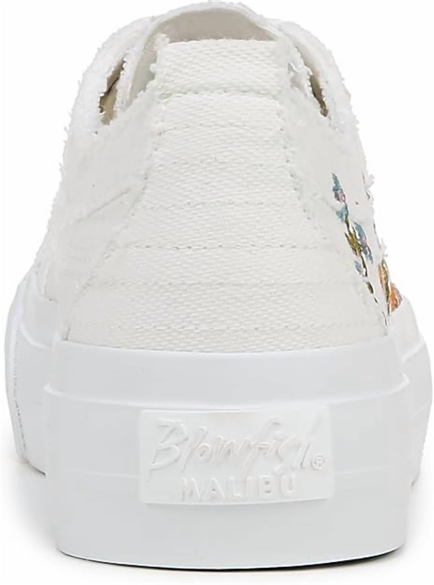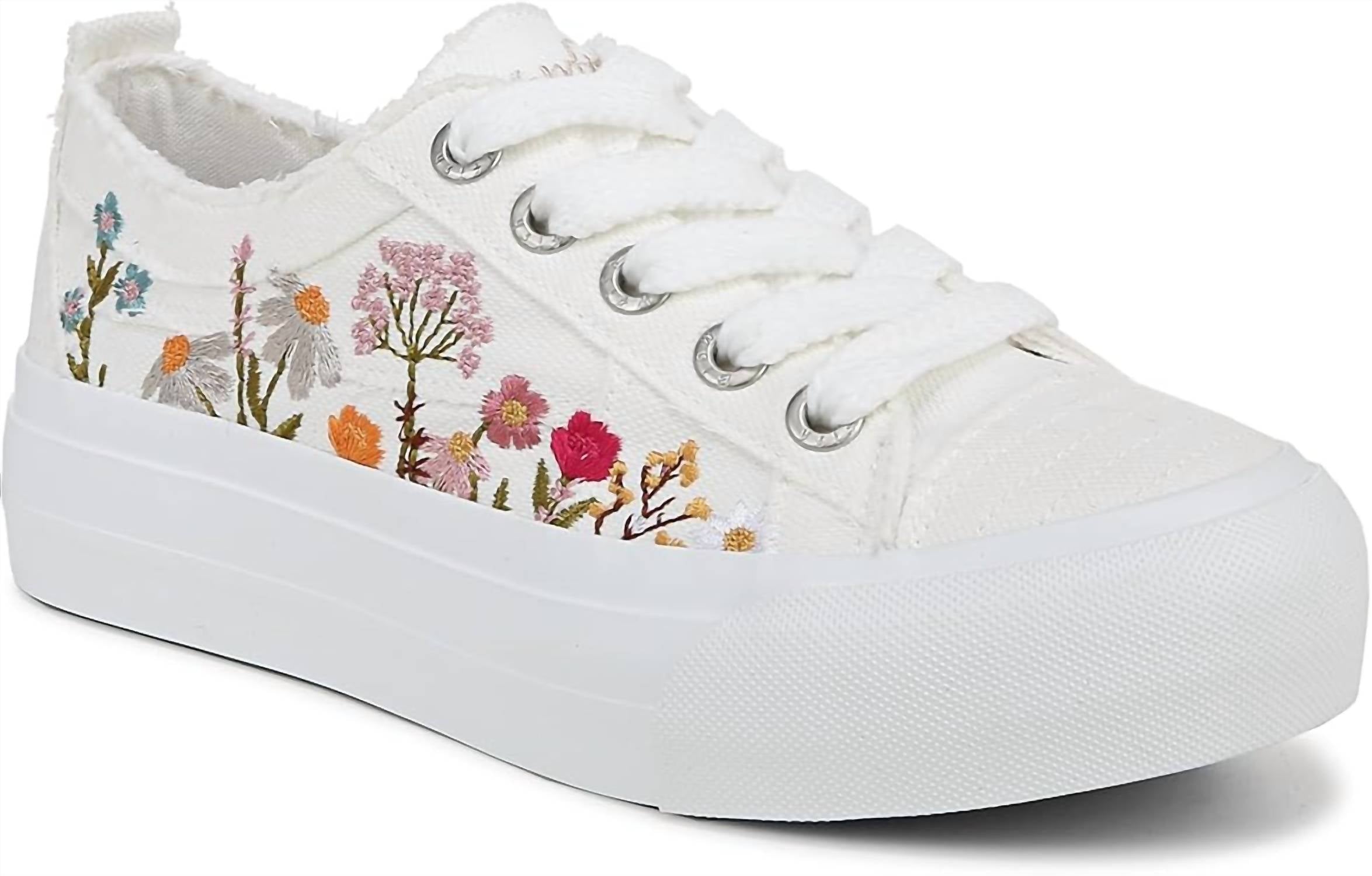 Cute, functional, and comfortable. These sneakers check all the boxes. Elevate your spring wardrobe with the Women's Sadie Sneakers by Blowfish Malibu, the perfect blend of style and comfort. Crafted from crisp white canvas with charming embroidered wildflowers, these sneakers feature a medium width and round toe design. The platform heel offers a flat and comfortable boost, perfect for all-day wear. Enjoy the easy lace-up style with eye-catching frayed edges, ideal for pairing with sundresses or casual denim.