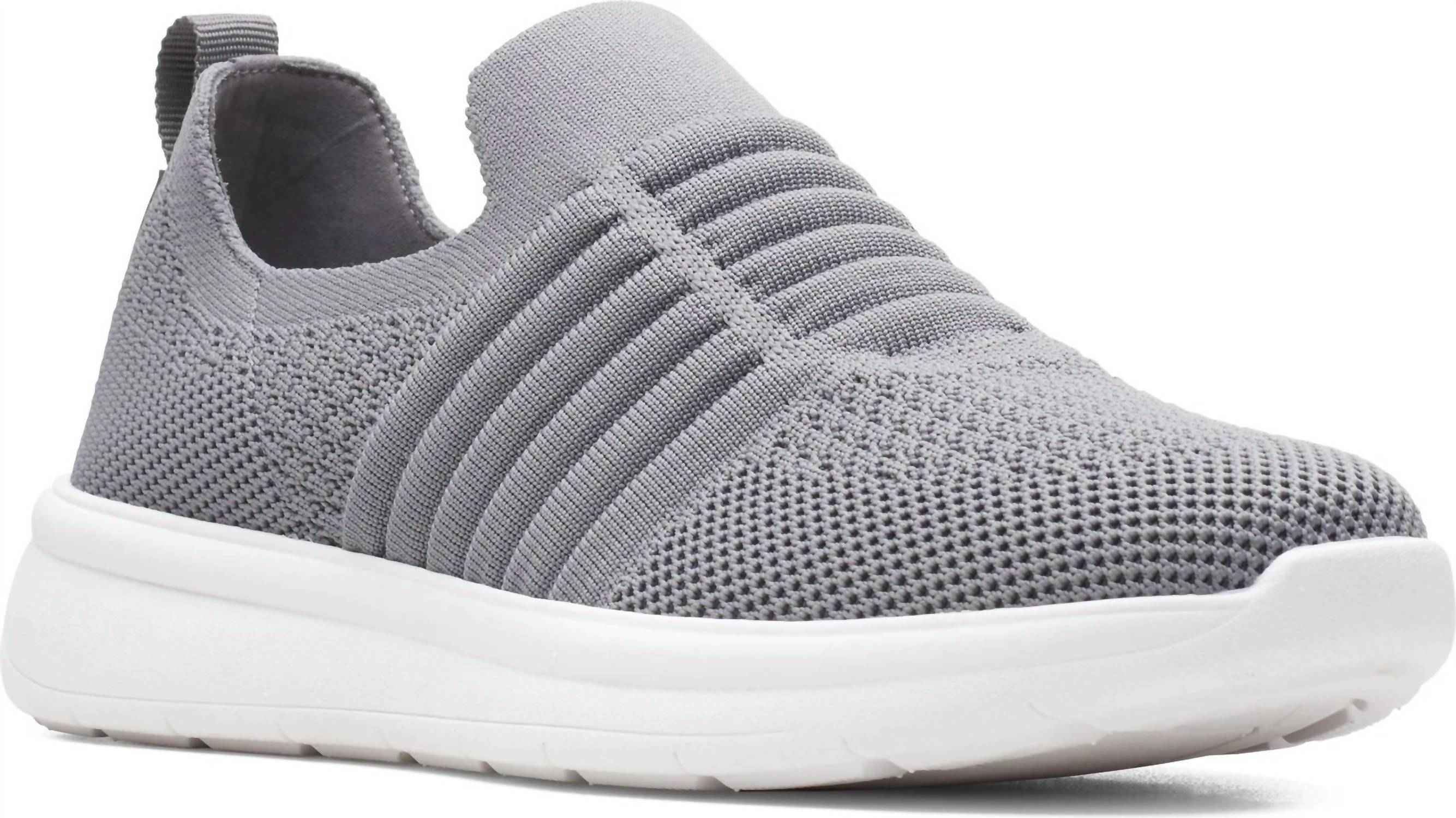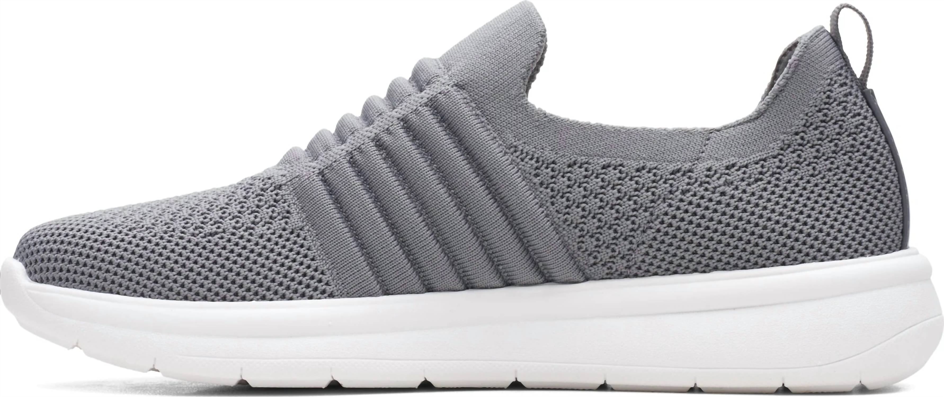 Cute, functional, and comfortable. These sneakers check all the boxes. Introducing the Women's Ezera Walk Sneaker by Clarks, designed for relaxed, everyday wear. This light grey, minimalist sneaker features a practical slip-on style with a round toe shape and flat heel, perfect for a spring dinner party. Its removable Cushion Soft™ footbed, combined with ultra-soft EVA foam, ensures exceptional comfort and is machine washable for easy care. The airy EVA sole provides excellent impact absorption, making each step feel effortless.