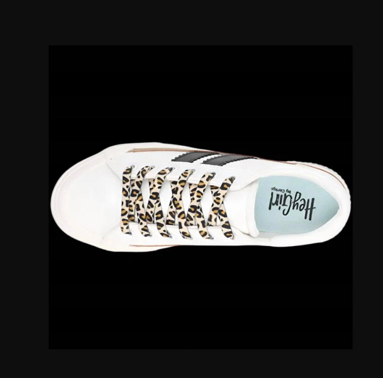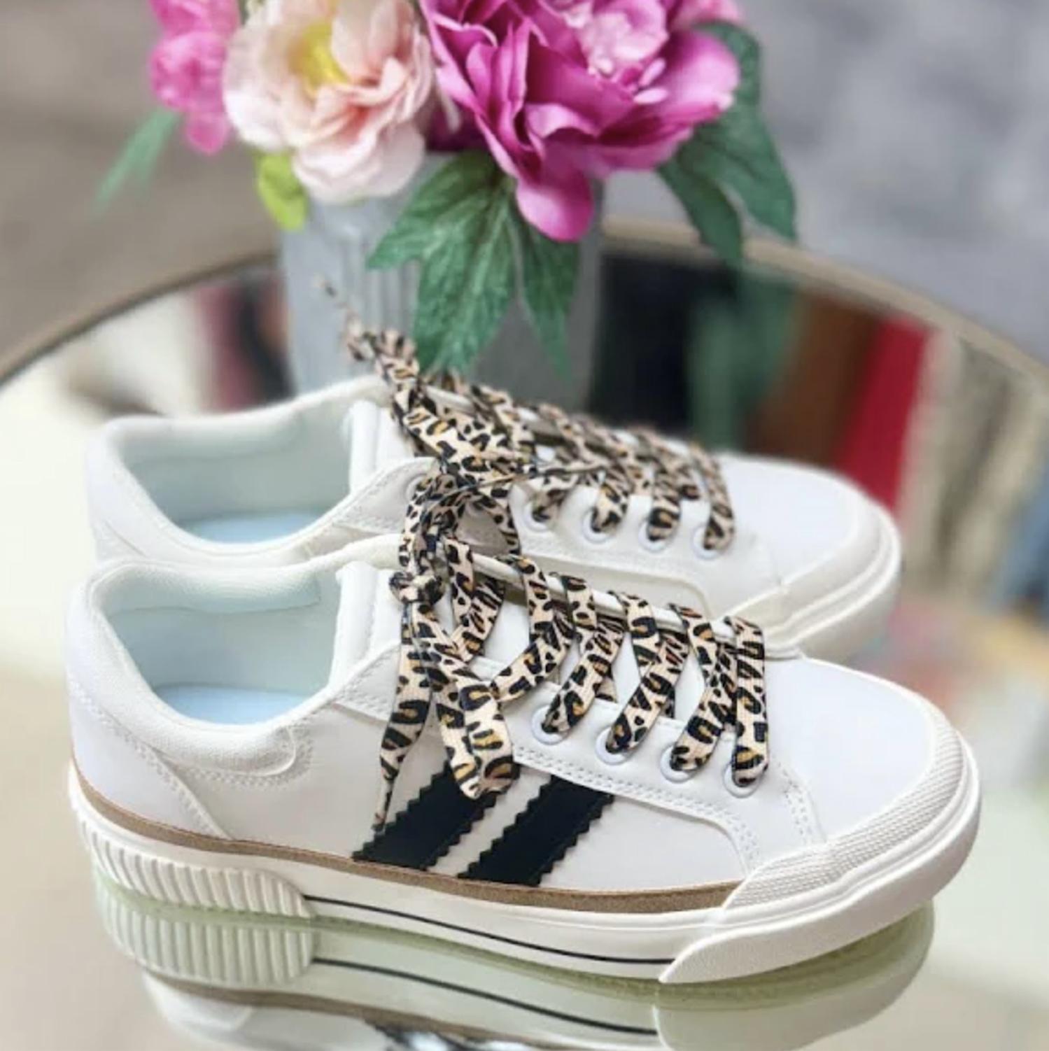 These sneakers have a faux leather upper, lace-up closure with animal print laces, and a cushioned footbed for comfort. They feature a round toe, two-stripe side detail, and a vulcanized platform midsole. The rubber outsole provides traction and durability. Made with premium materials for long-lasting wear.