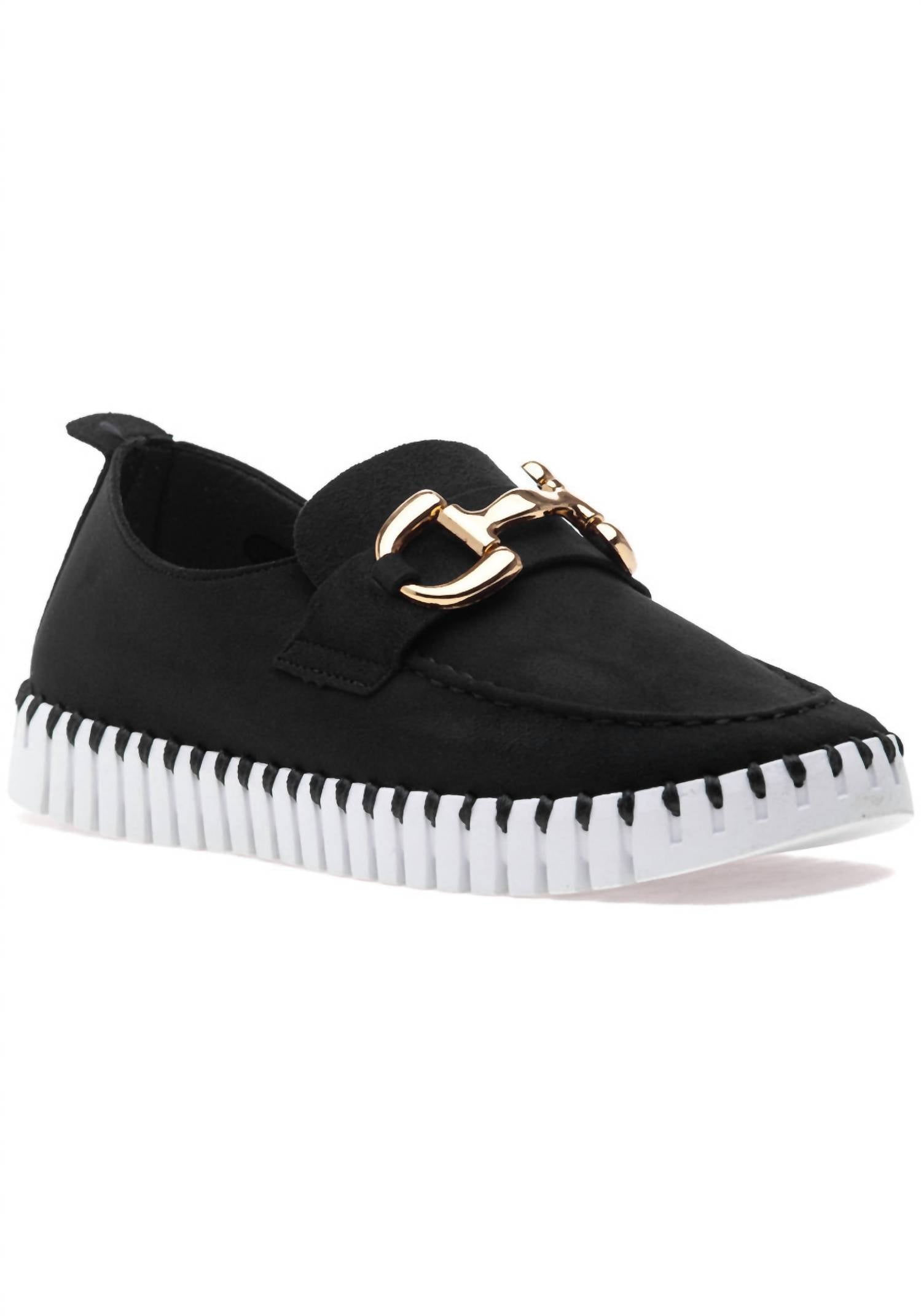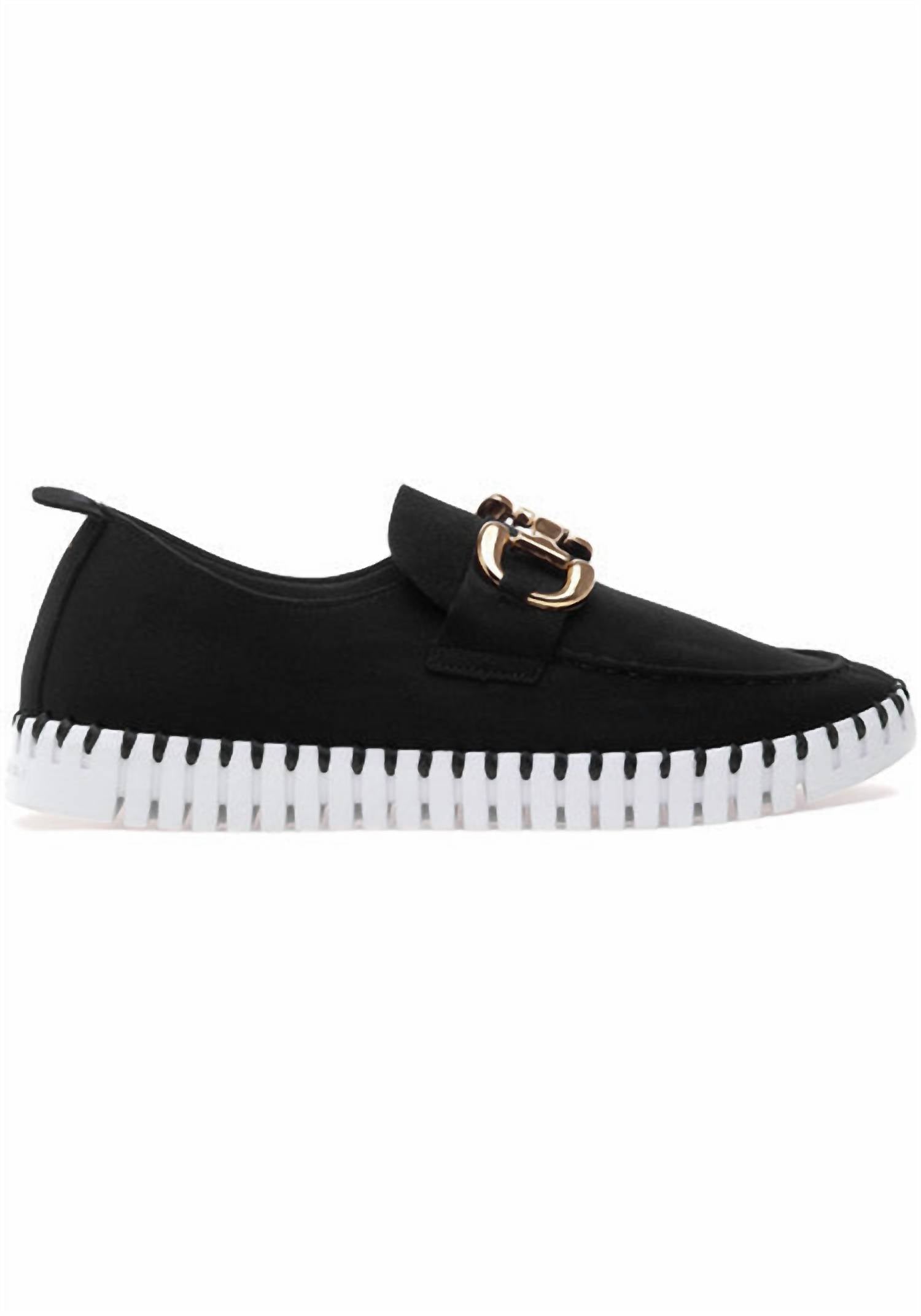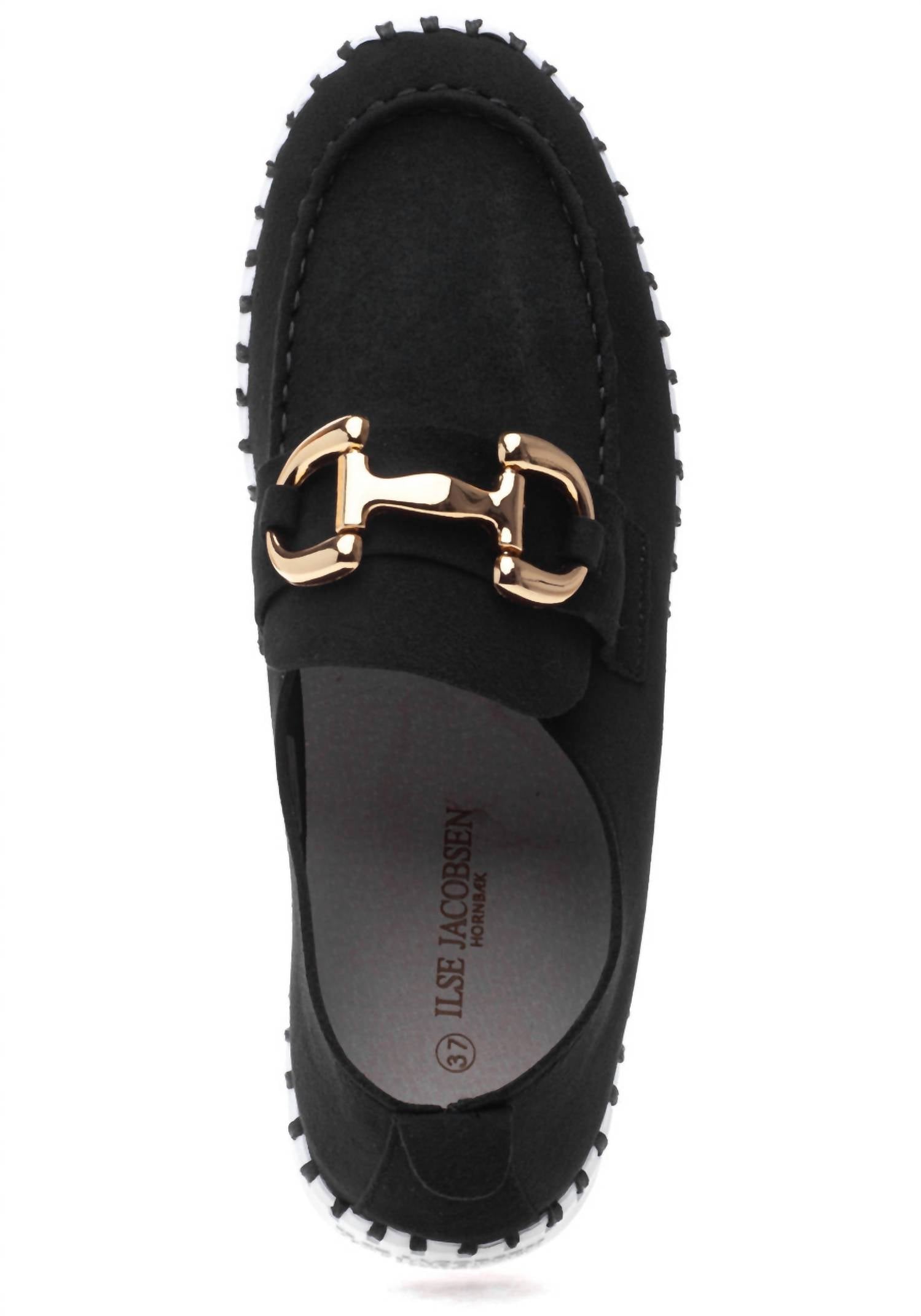 When fashion and function come together seamlessly. Discover timeless elegance with the Women's Tulip Buckle Flat Shoes by Ilse Jacobsen, a perfect choice for minimalist style. Adorned with a decorative gold-tone buckle, these slip-on flats are expertly crafted from recycled microfiber for sustainability. They feature a comfortable 1" flat heel platform and a medium-width round toe for everyday wear. The rubber sole comprises 75% natural rubber and 25% recycled rubber. Ideal for any spring travel occasion, these black flats are exclusively available in whole sizes, with a recommendation to size up for half sizes.