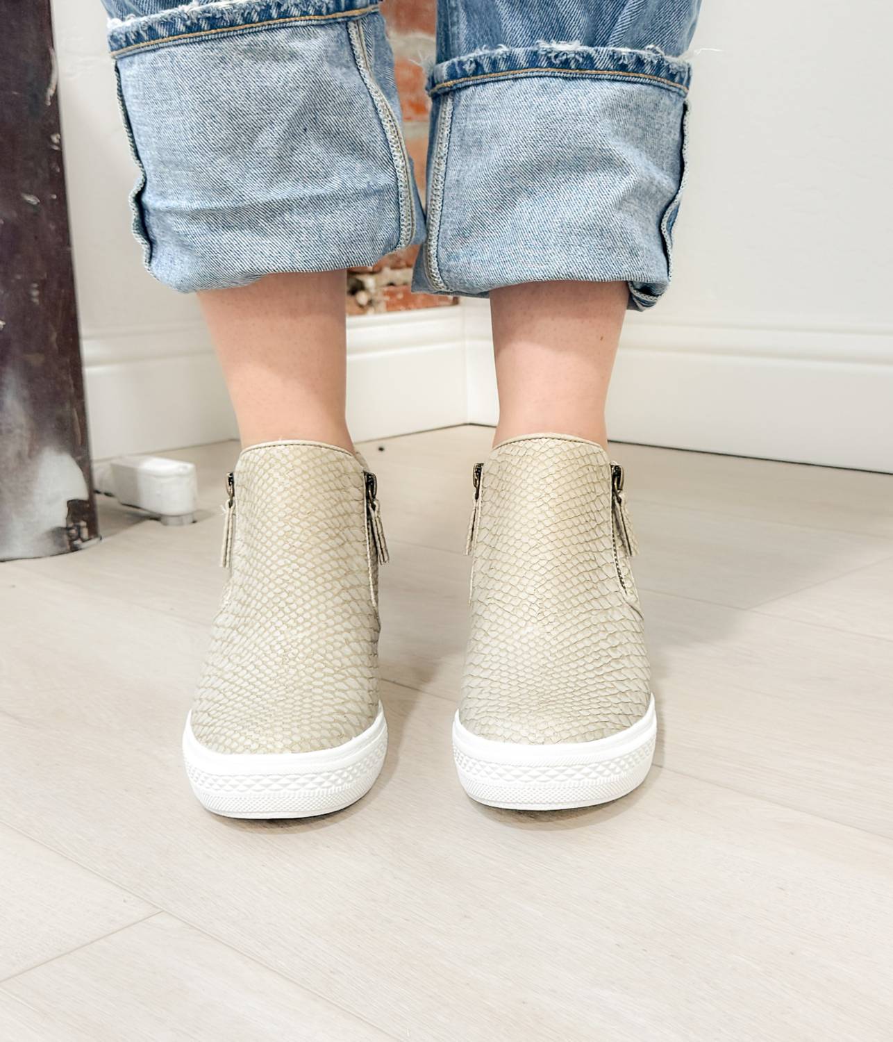 Cute, functional, and comfortable. These sneakers check all the boxes. Step into style and comfort with the Women's Timmibelle Wedge Sneaker by Not Rated, a chic choice for your travel adventures. Crafted in cream faux leather embossed with a reptile pattern, these sneakers feature a 2-inch wedge heel for just the right lift. The round toe design and ultra comfort footbed ensure all-day wearability, while the zipper closures on both sides add a functional flair. Perfect for minimalist fall ensembles, these sneakers are a versatile addition to your wardrobe.