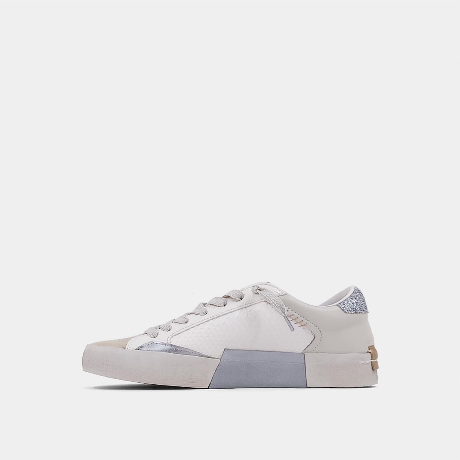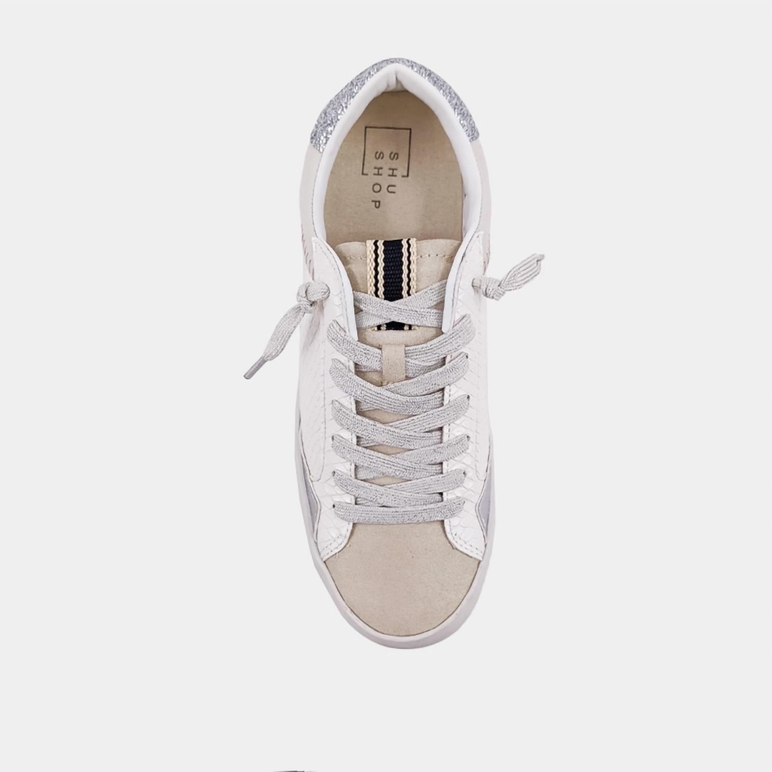 Get your daily steps in with these adorable sneakers. Step into modern style with these low-top sneakers, made from soft textiles, faux leather, and artificial suede. The neutral upper features a subtle snake-like texture, clean stitching, and a hint of glitter at the ankle for a cool twist. Distressed details add character, while durable rubber soles provide all-day comfort. Perfect with trousers or skirts, these sneakers blend timeless appeal with everyday versatility.