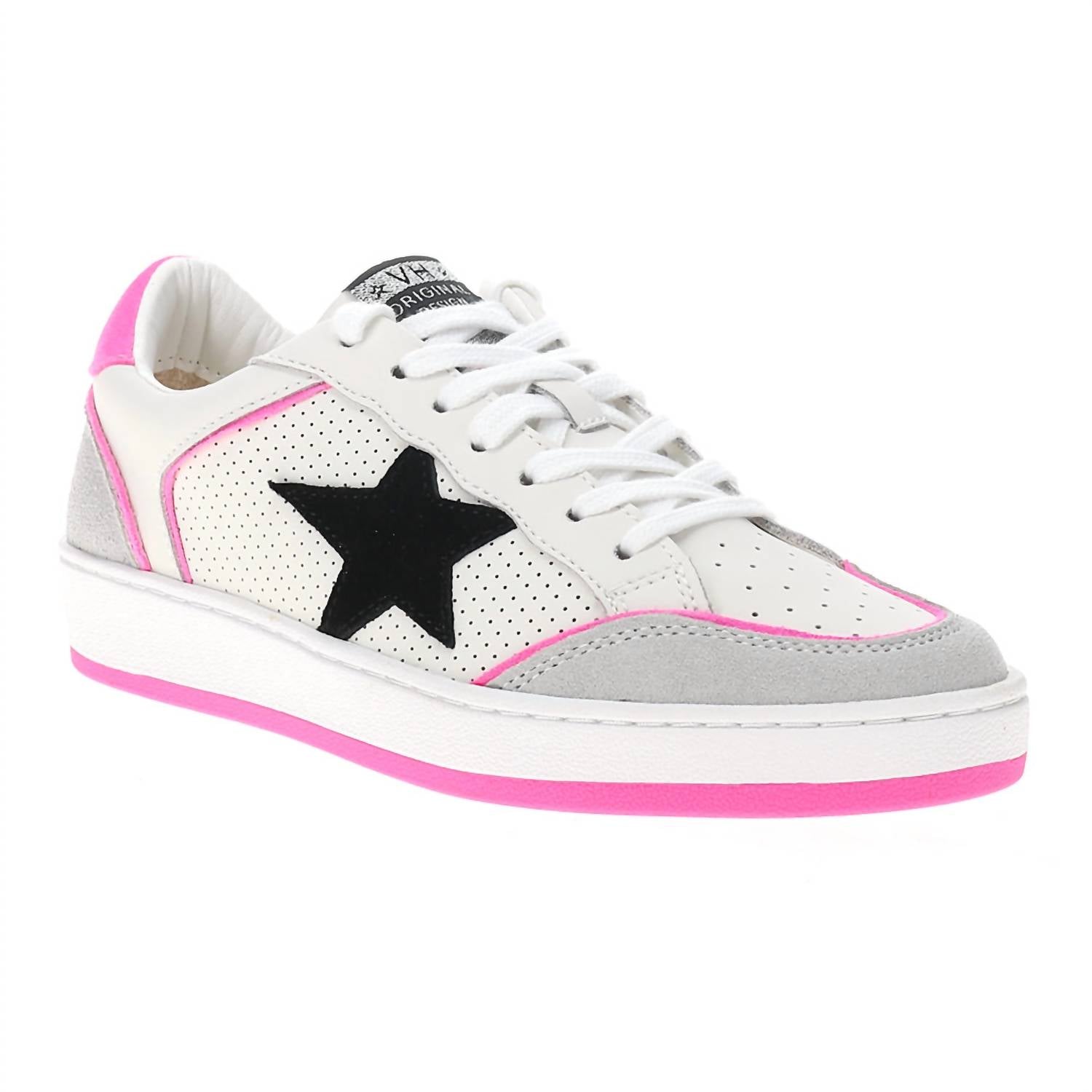 Quando moda e funcionalidade se unem perfeitamente. Aprimore seus tênis com o Tênis Feminino Delma da Vintage Havana. Estes tênis estilosos em um tom branco clean apresentam uma estrela preta divertida com um toque de fúcsia, criando uma pegada ousada. Feitos em couro legítimo, eles apresentam um formato clássico de bico redondo para um visual atemporal. Perfeitos para mulheres adultas que buscam conforto e estilo em sua coleção de calçados.