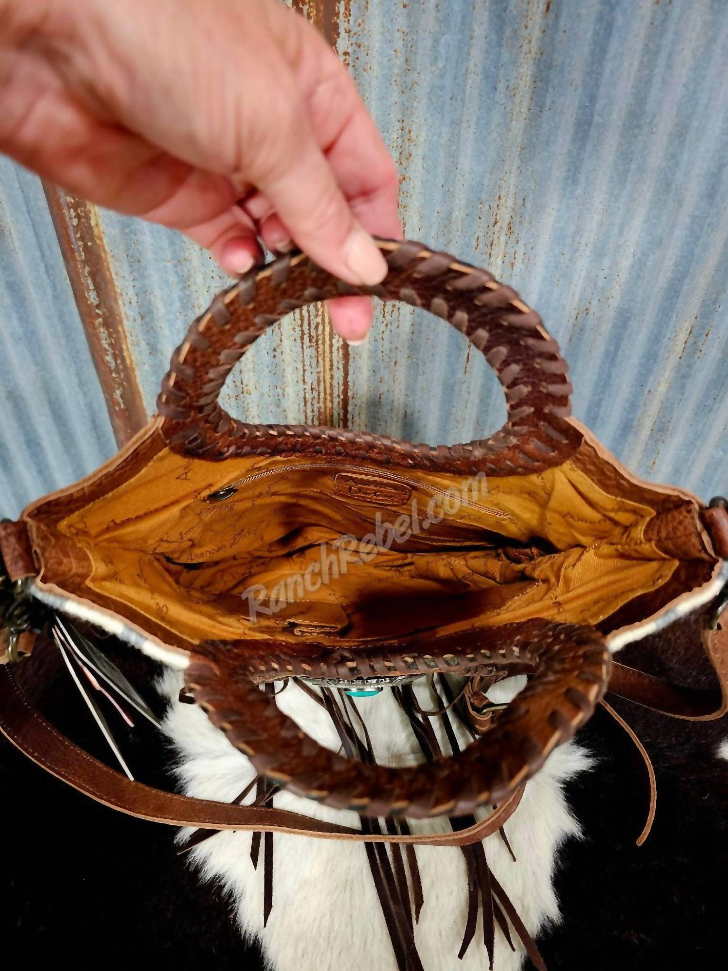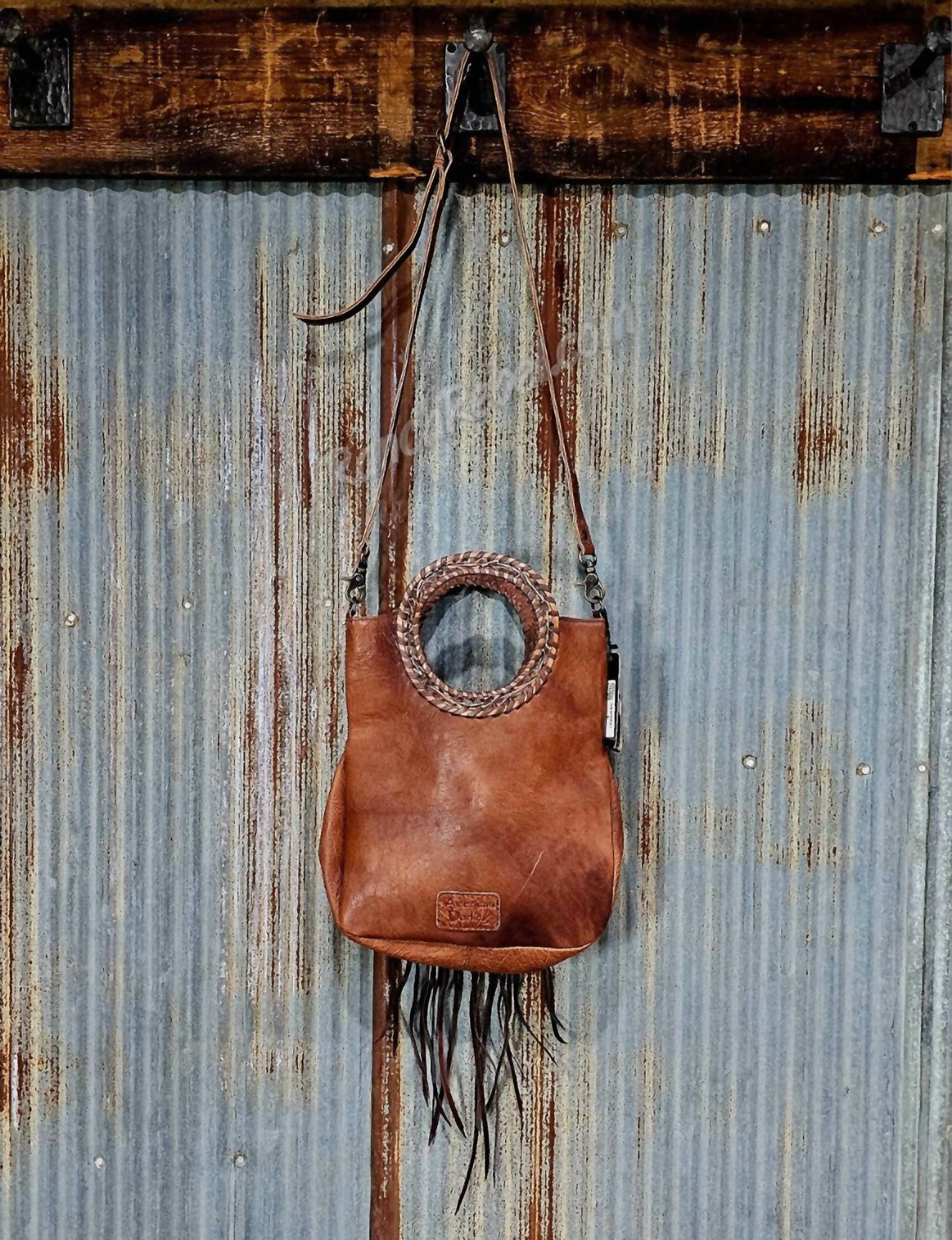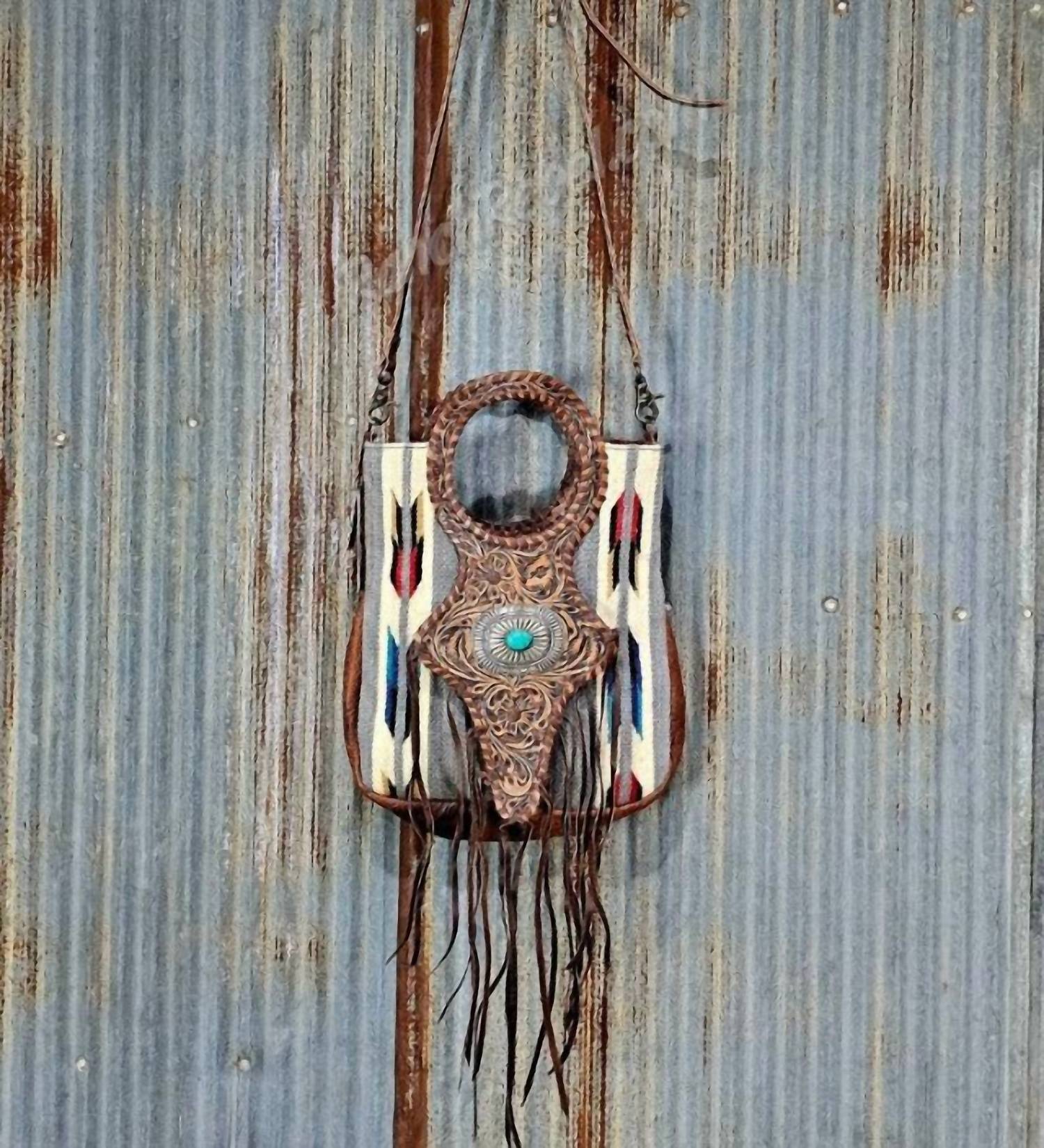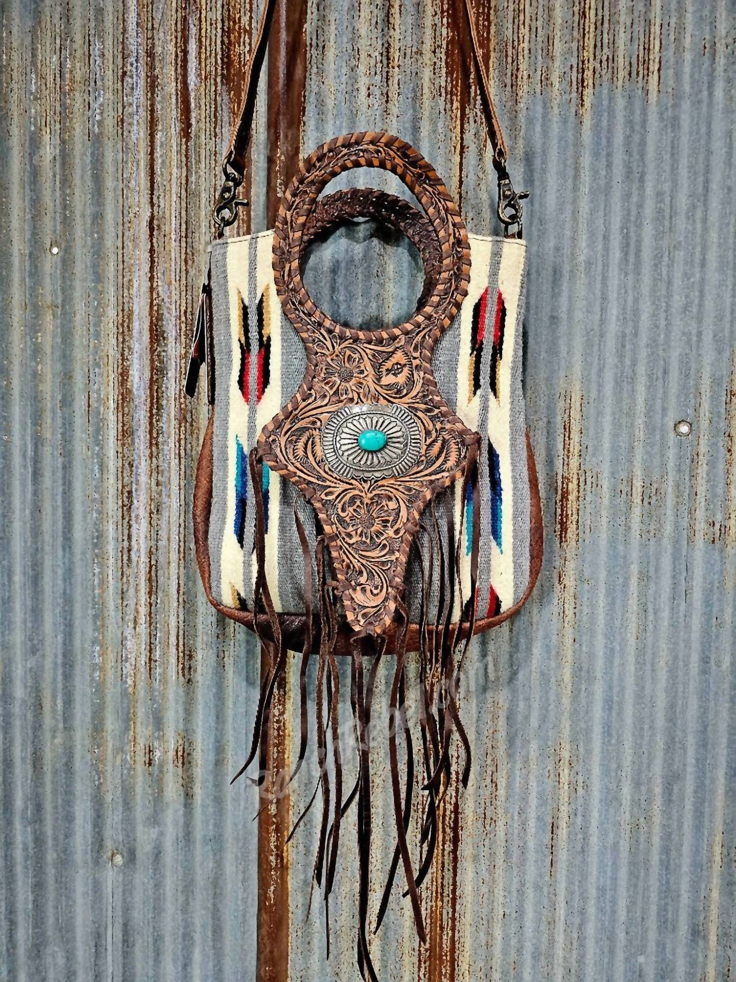 This crossbody bag will be your go-to bag of the season. Introducing the Serape Round Handled Bag #5806 by American Darling, a striking crossbody bag in a Brown Multi colorway. The front showcases a woven serape fabric with an intricate array of soft gray, cream, teal, taupe, red, and black hues, complemented by a tooled leather flap adorned with a silver buckle and faux turquoise stone. Measuring 13.5" high x 12" wide x 4" deep, this bag features genuine leather, whipstitched round handles, leather fringe, and a detachable, adjustable strap that is 1" wide. Closure: Open top. The interior includes a side zip pocket and two side slip pockets for added organization.