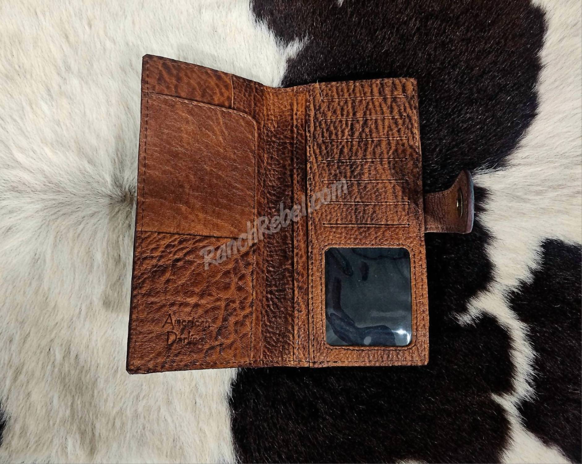 Introducing the Women's Leather Wallet by American Darling, a beautifully crafted piece washed in turquoise for a rustic yet refined appearance. Made from genuine leather, it features a tooled floral, diamond, and dot design on both sides. The wallet measures 7.75" x 4" and includes a leather fold-over with a magnetic snap closure. The interior boasts rich brown leather with six credit card slots, five slip pockets, and an ID pocket.