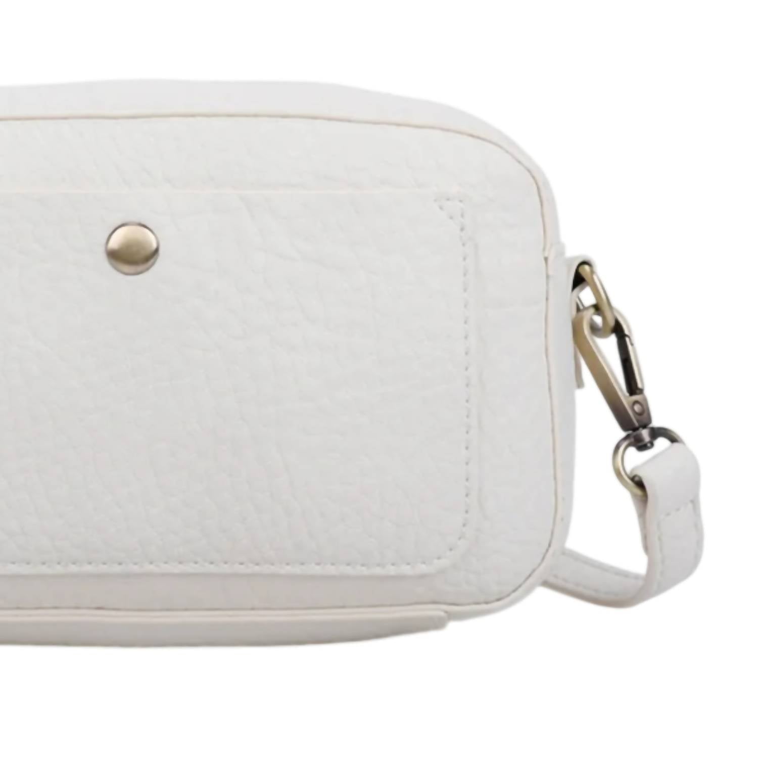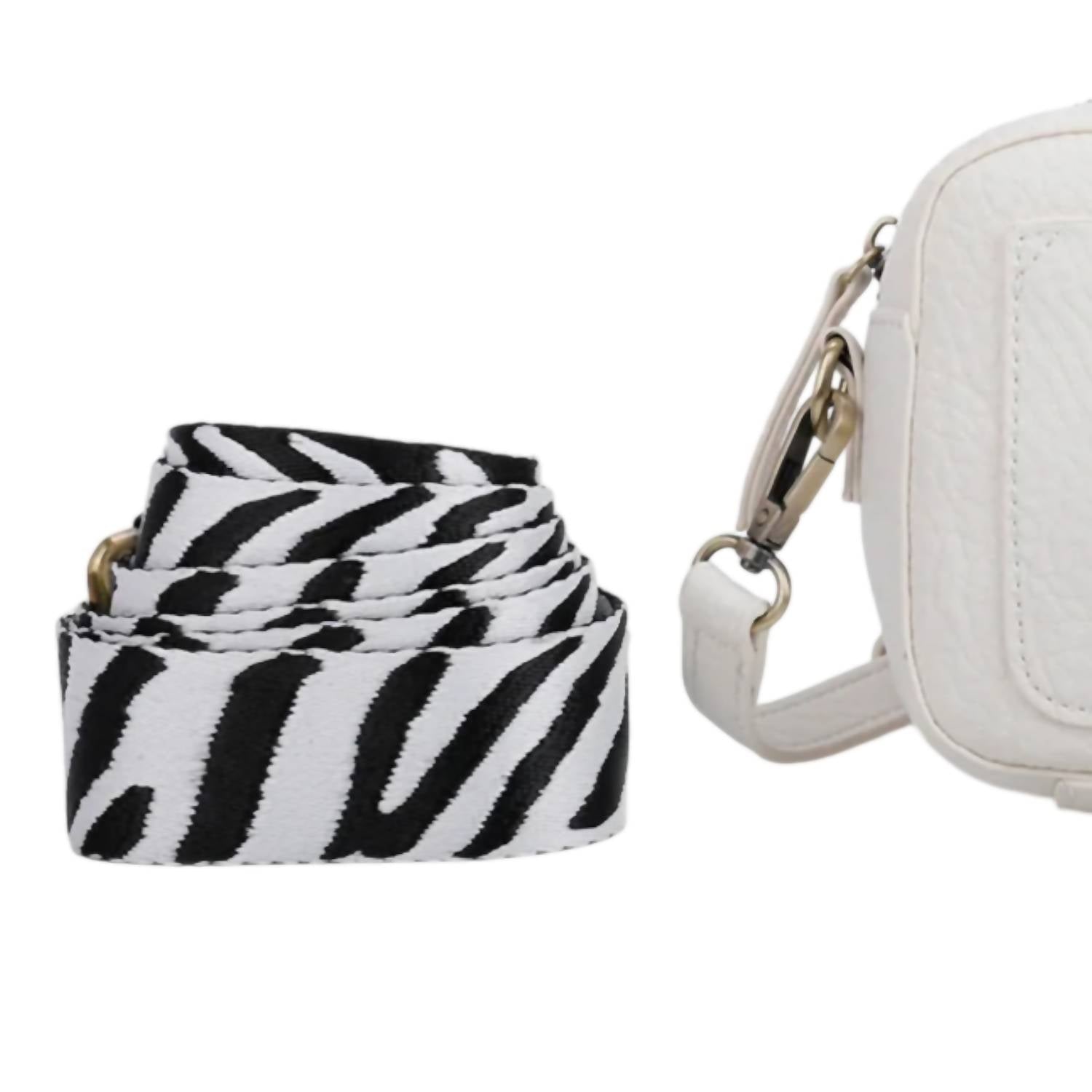 Introducing the Women's Betty Crossbody by Ampere Creations, a stylish and versatile bag crafted from premium vegan leather. It showcases biker brass hardware and a minimalist design, perfect for any occasion. This compact bag measures 7.5" L x 5" H x 2.5" W and includes a regular detachable shoulder strap with a 27-inch drop length, as well as a unique zebra guitar strap with a 24-inch drop length. Available in up to 14 striking colors, its customization options are endless, making it a unique and personal accessory.
