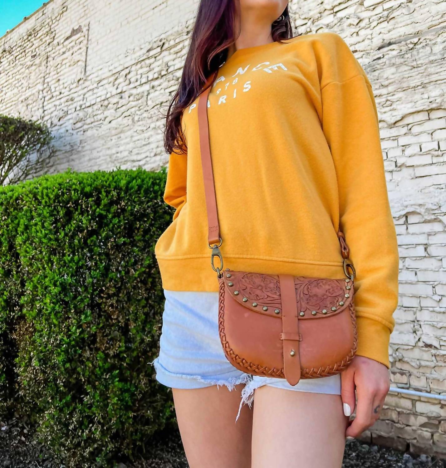 The Women's Cassie Convertible Leather Crossbody Bag by Anabaglish is crafted from high-quality tooled leather in a warm brown hue. Stylish antique brass hardware and rivet details accentuate its design, while dual leather straps provide versatile styling options—transitioning from a belt bag to a crossbody or shoulder bag with ease. Its practical features include a cotton lining, one interior pocket, and dimensions of 8" width, 1.18" depth, and 6" height. The belt measures 41.25" in length with a strap drop of 21.5", perfect for the modern city explorer.