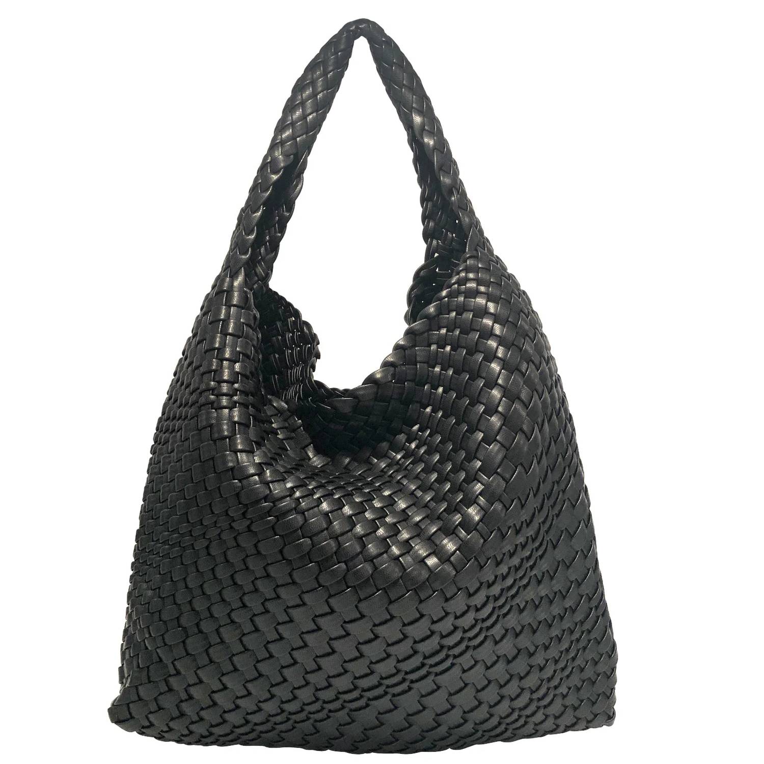 Woven vegan shoulder bag. 13" width x 11" height x 5" depth Dimension. Features an interior security bag and large magnet closure.