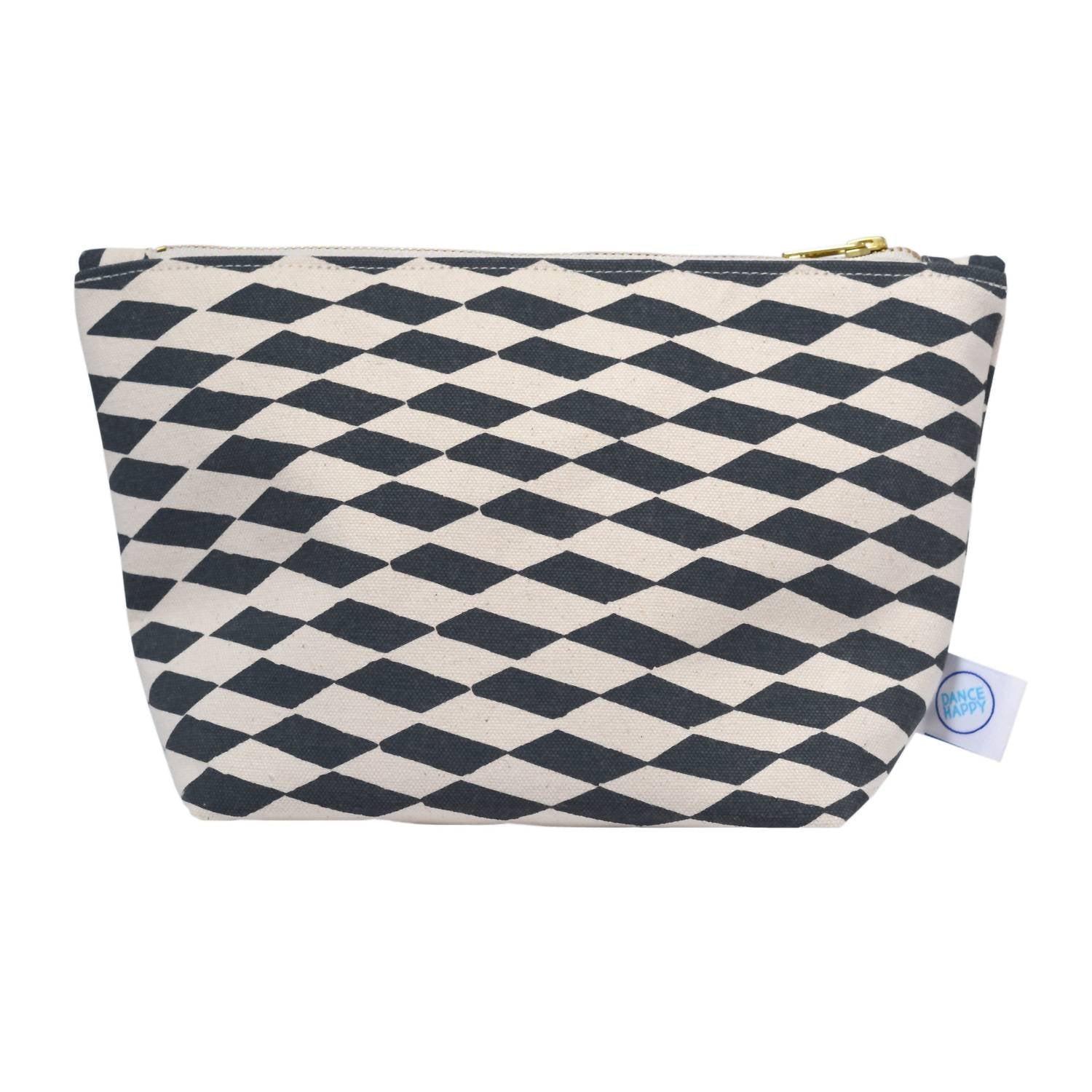 Uma bolsa estilosa para usar com maquiagem, cuidados com a pele ou qualquer outra coisa que você queira levar em viagens com estilo. Confeccionada em lona de algodão de 425 g e forrada com algodão orgânico, apresenta um impressionante padrão geométrico cortado à mão e serigrafado em ardósia escura. Medindo aproximadamente 26 cm x 18 cm com fundo reforçado de 10 cm, a bolsa é fechada com um zíper de latão durável. Feita à mão nos EUA, recomenda-se lavá-la à mão (de preferência, limpeza localizada) e não usar alvejante.