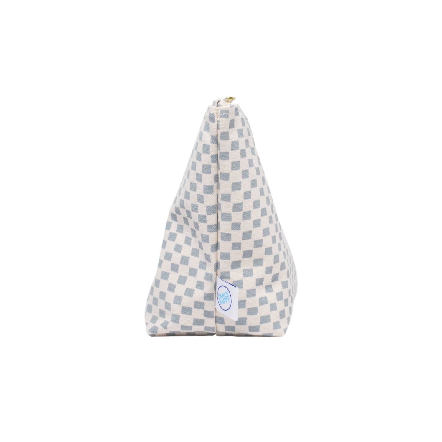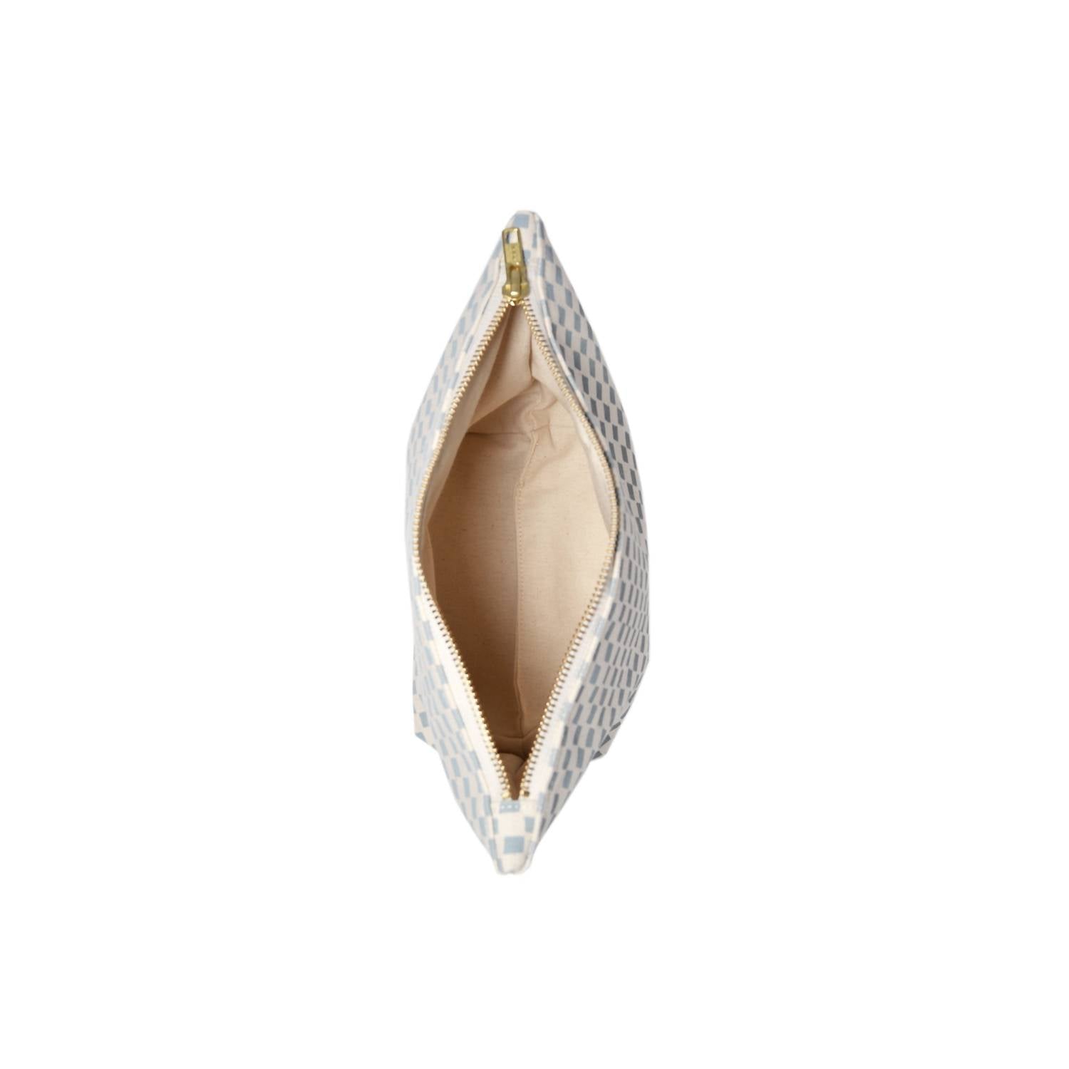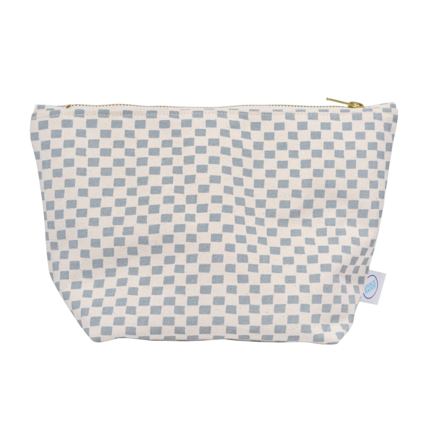Uma bolsa estilosa para usar com maquiagem, cuidados com a pele ou qualquer outra coisa que você queira levar em viagens com estilo. Confeccionada em lona de algodão de 425 g em uma elegante combinação de azul-aço e bege, apresenta um padrão exclusivo cortado à mão, serigrafado com tinta ecológica e atóxica. Esta bolsa mede aproximadamente 27,5 cm x 18,7 cm, com fundo de fole de 10 cm e forrada com algodão orgânico. Zíper de latão. Lavar somente à mão, preferencialmente para limpeza localizada, evitando alvejantes. Feito à mão nos EUA.
