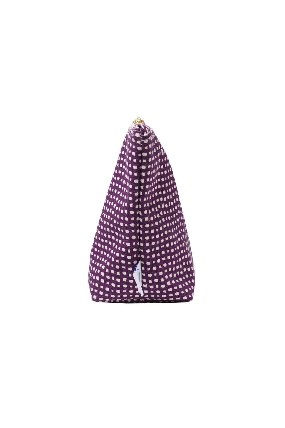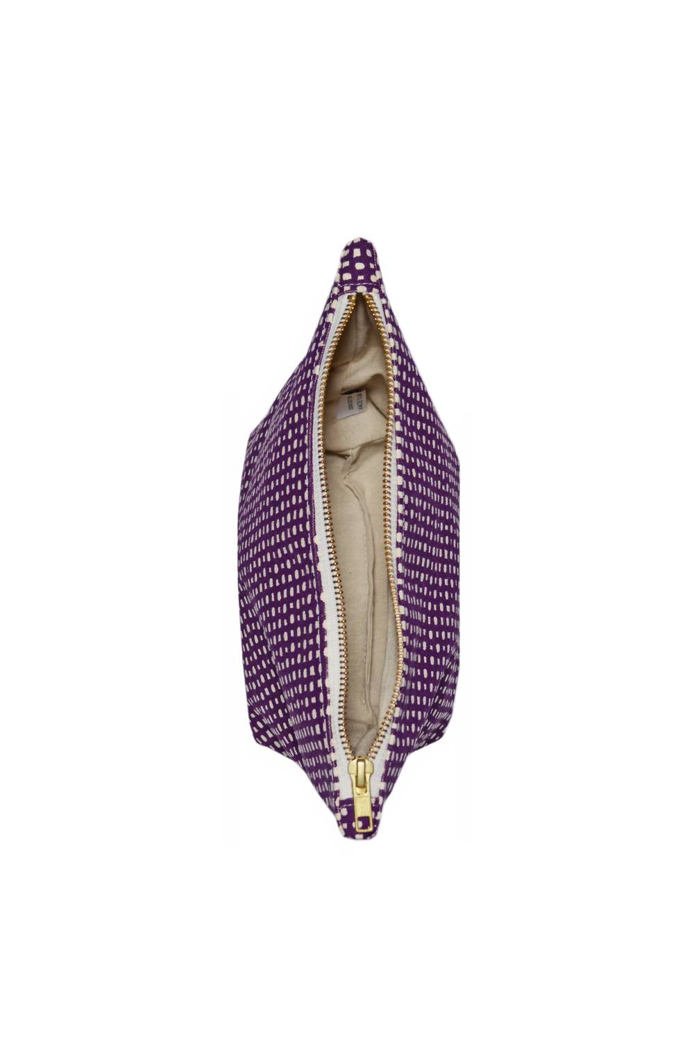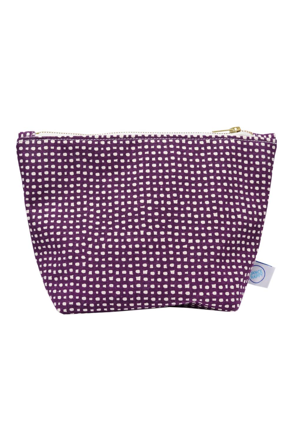 Esta bolsa com zíper atinge o equilíbrio perfeito entre espaçosa e compacta, oferecendo bastante espaço para seus itens essenciais sem ocupar toda a mala. Feita em lona de algodão de 425 g, apresenta um padrão circular desenhado à mão e serigrafado em ameixa italiana. A bolsa é forrada com algodão orgânico e mede aproximadamente 27,5 cm x 18,7 cm, com um fundo reforçado de 10 cm para maior profundidade. O fecho de zíper de latão garante segurança e a serigrafia utiliza tinta ecológica e atóxica. Recomenda-se a limpeza localizada e a lavagem somente à mão (não usar alvejante). Feito à mão nos EUA.