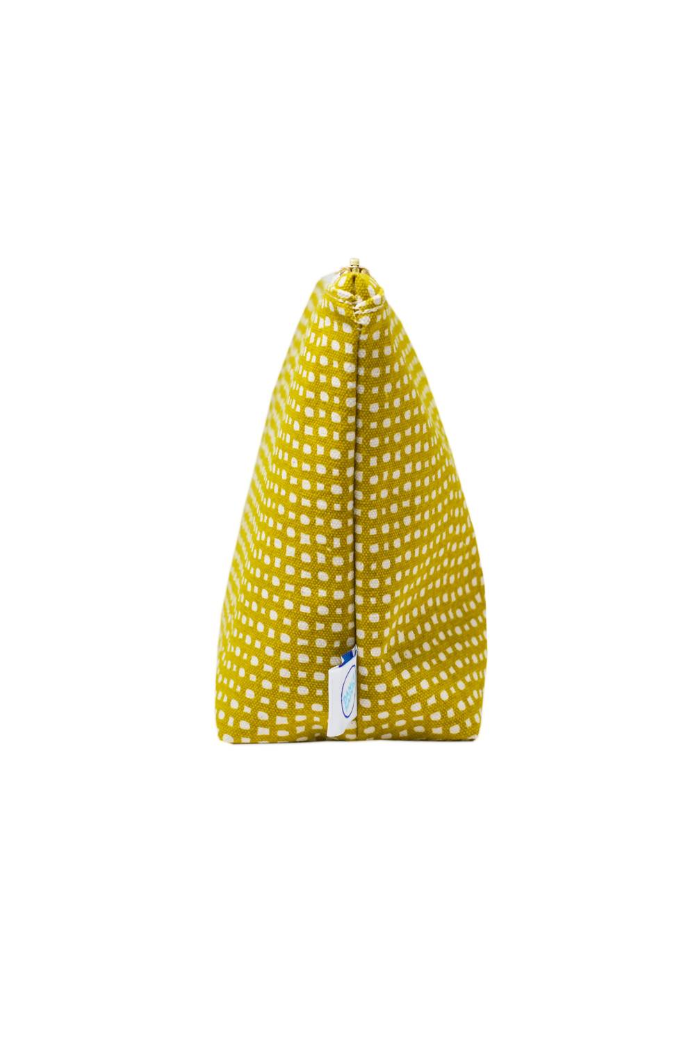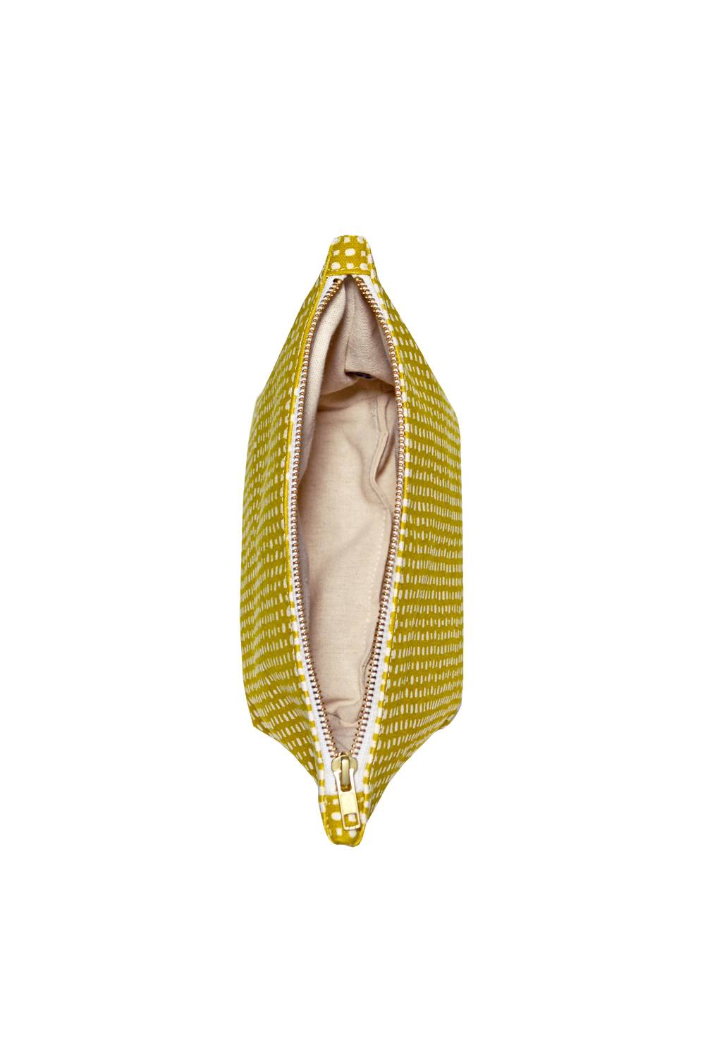 Esta bolsa com zíper atinge o equilíbrio perfeito entre espaçosa e compacta, oferecendo bastante espaço para seus itens essenciais sem ocupar toda a mala. Confeccionada em lona de algodão de 425 g, apresenta um padrão circular desenhado à mão e serigrafado em Golden Flax. A bolsa é forrada com algodão orgânico e mede aproximadamente 27,5 cm x 18,7 cm, com um fundo reforçado de 10 cm para maior profundidade. O fecho de zíper de latão garante segurança e a serigrafia utiliza tinta ecológica e atóxica. Recomenda-se a limpeza localizada e a lavagem somente à mão (não usar alvejante). Feito à mão nos EUA.